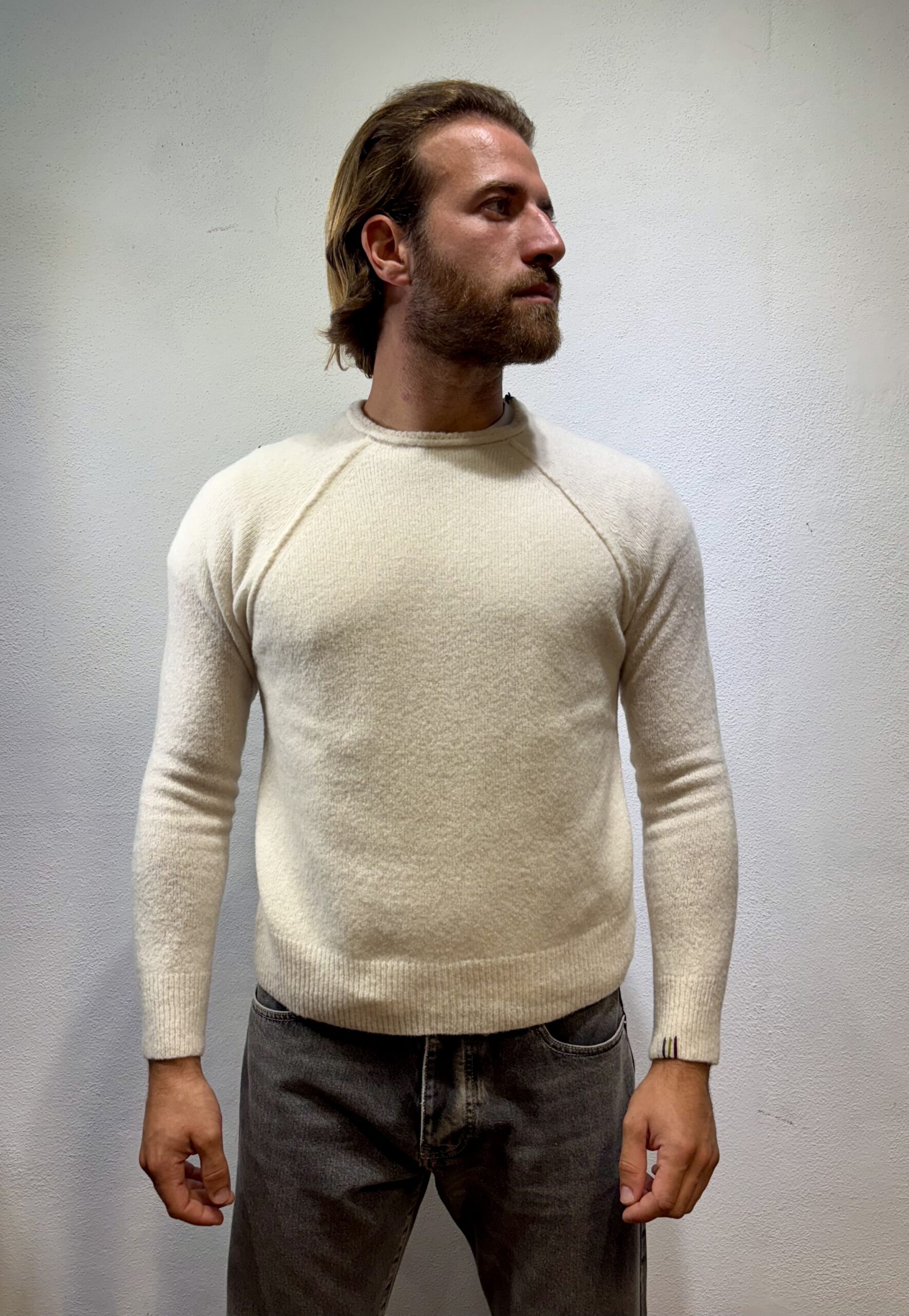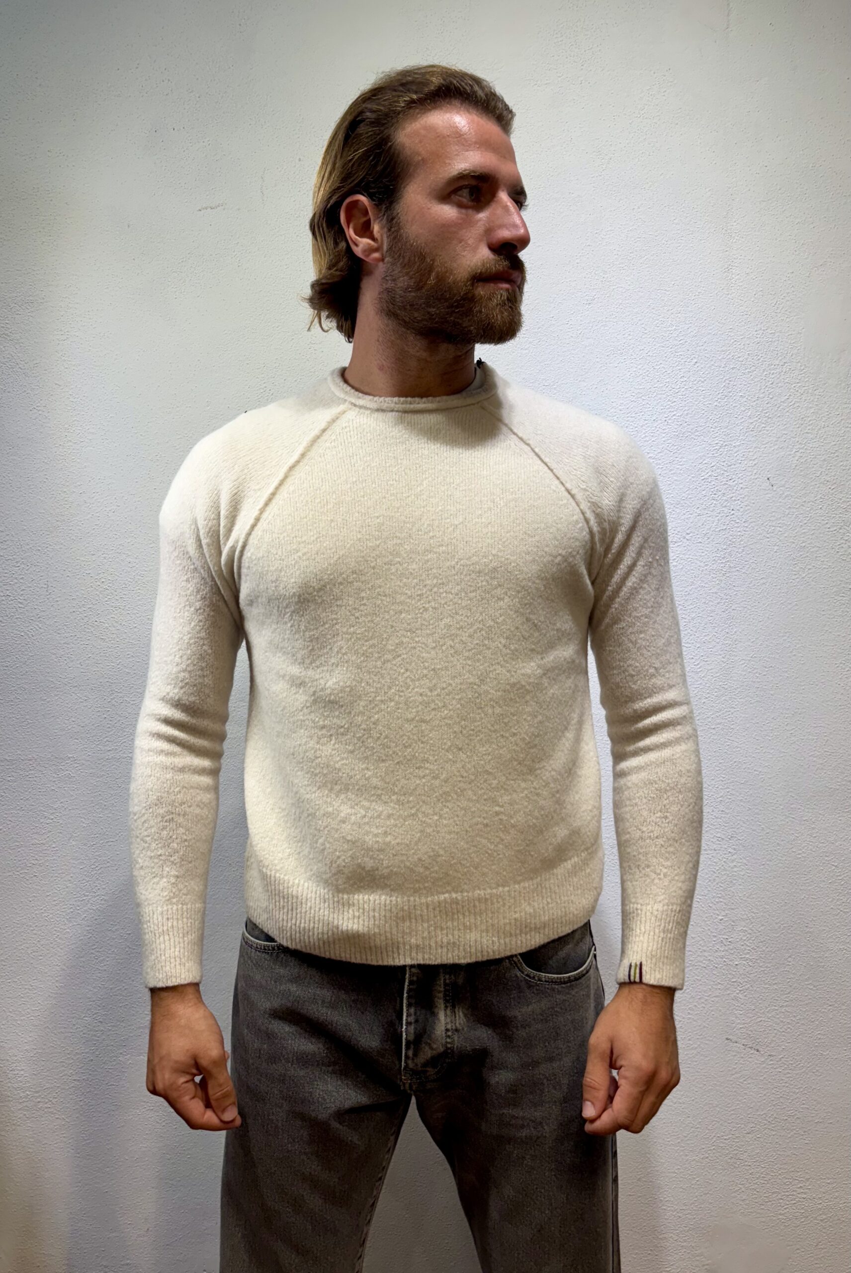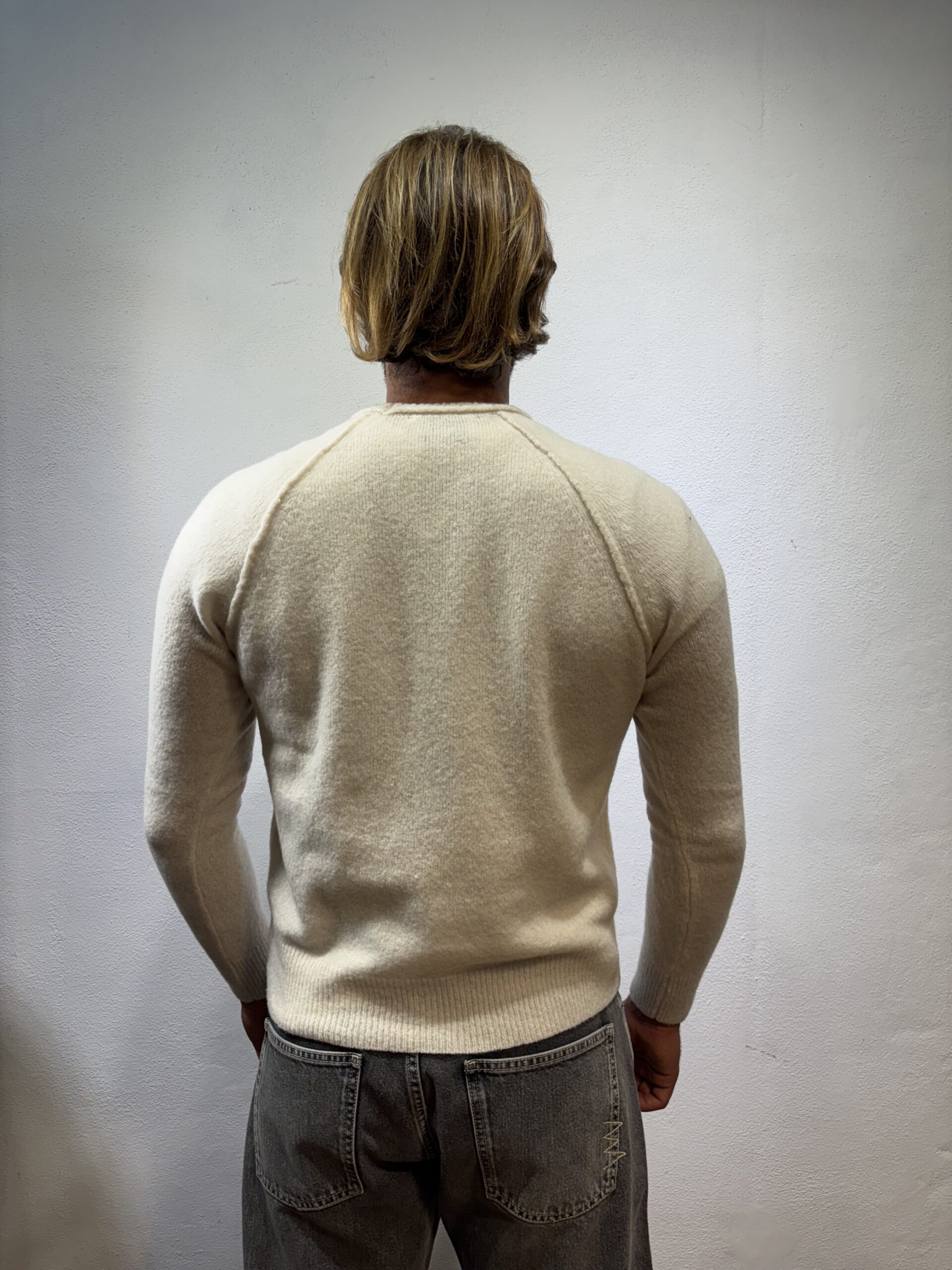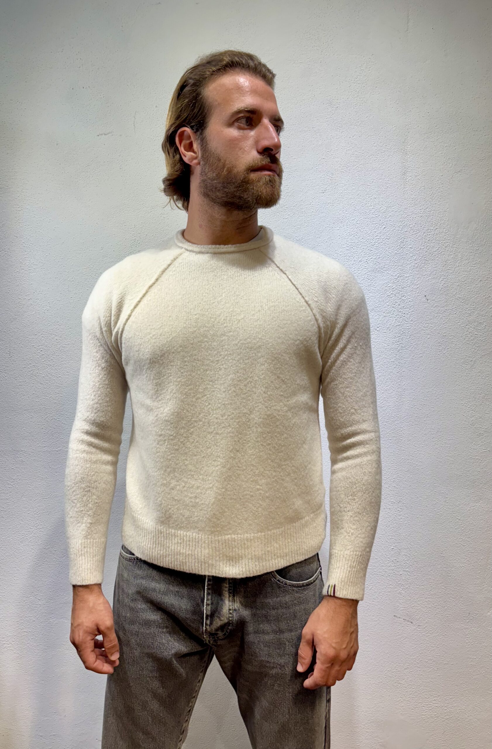 Alpha Studio girocollo in lana panna spalla raglanGirocollo in misto lana con spalla raglan colore panna, con taglio vivo Vestibilità slim Composizione 80% lana vergine 20% poliammide Made in Italy Il modello veste una taglia Media 48 italiana Altezza modello 1,81 peso 78 kg
