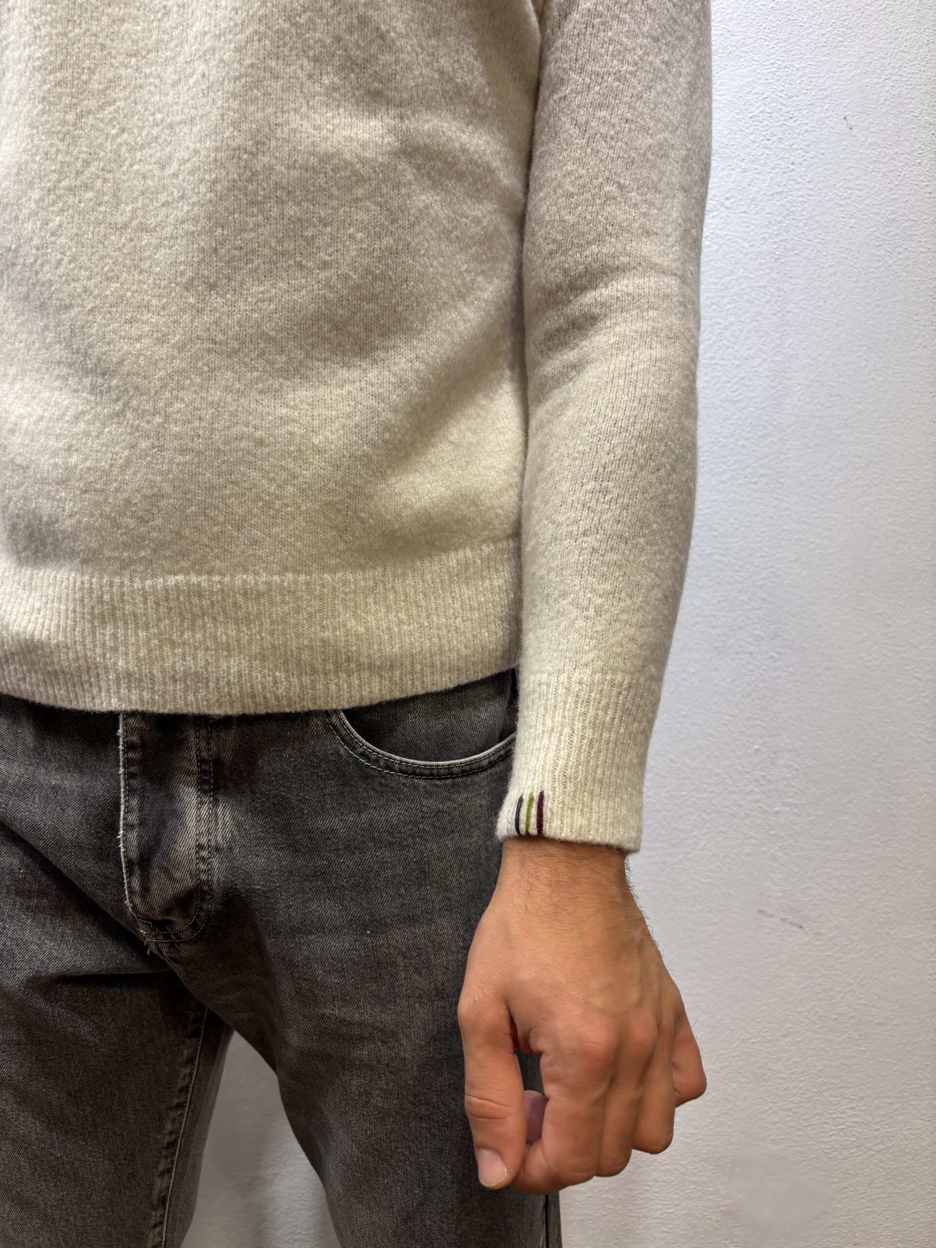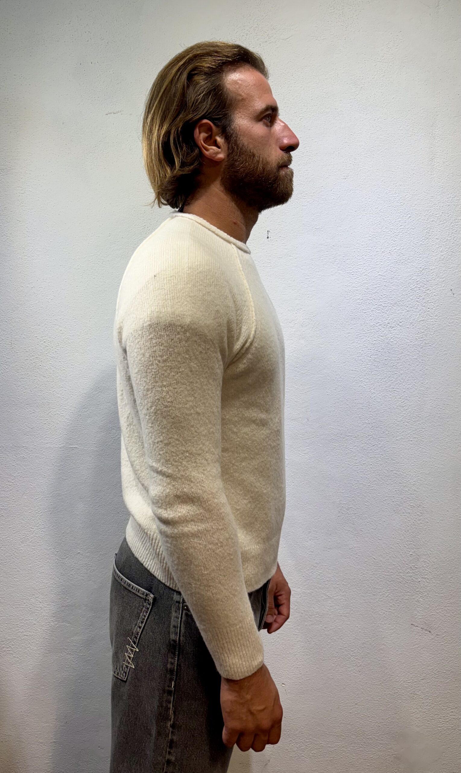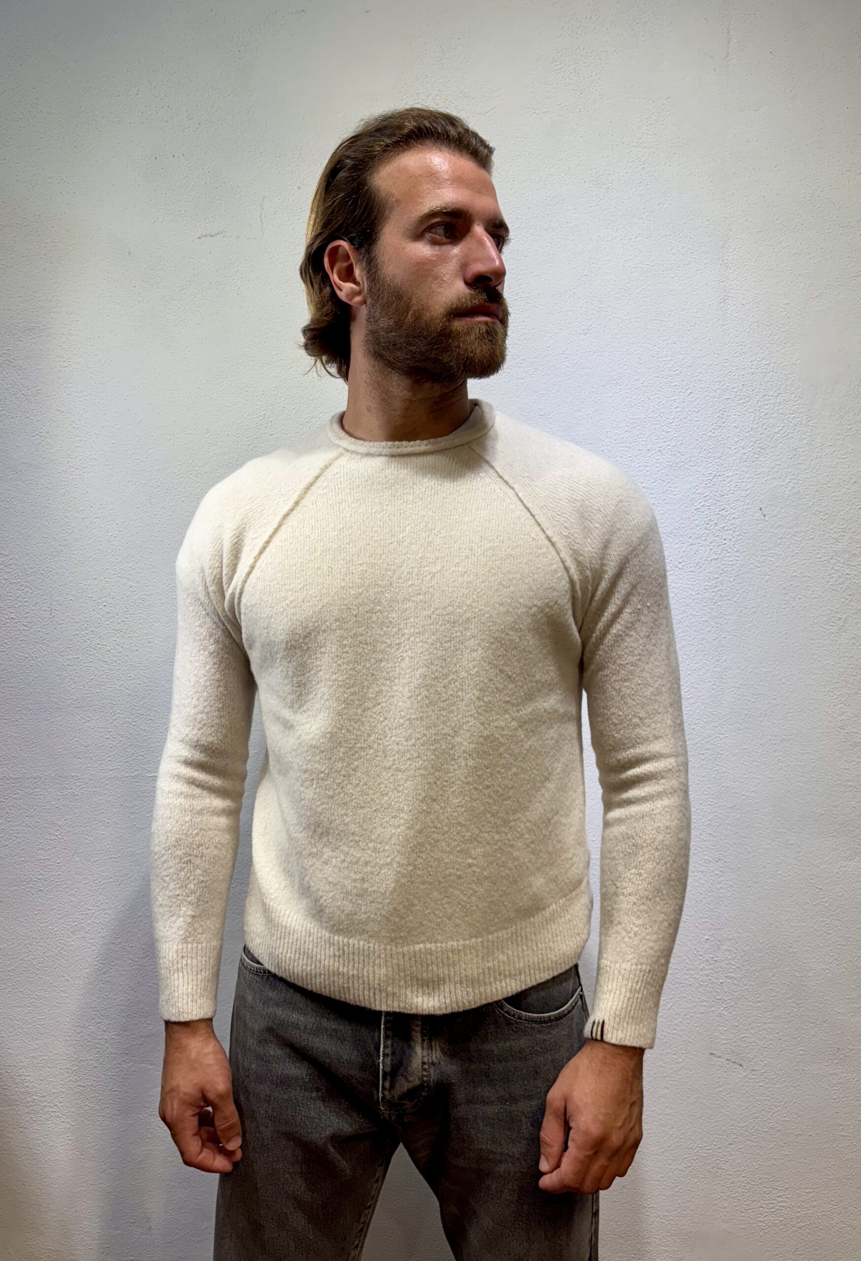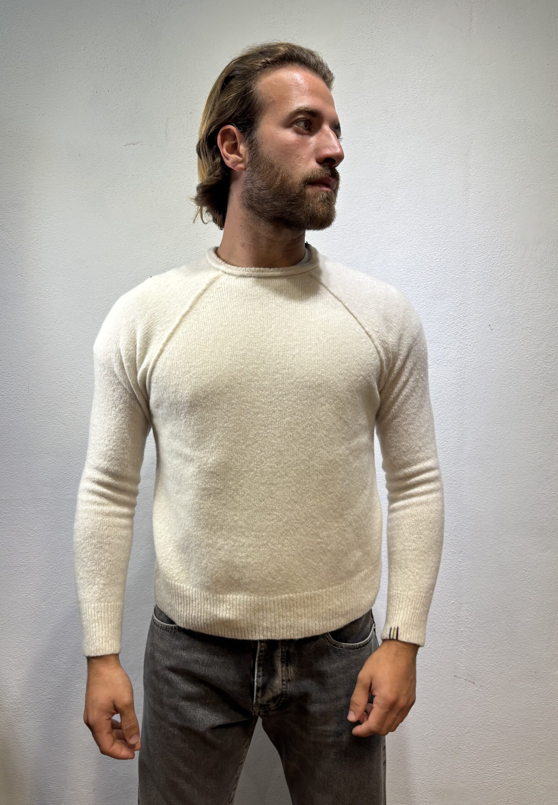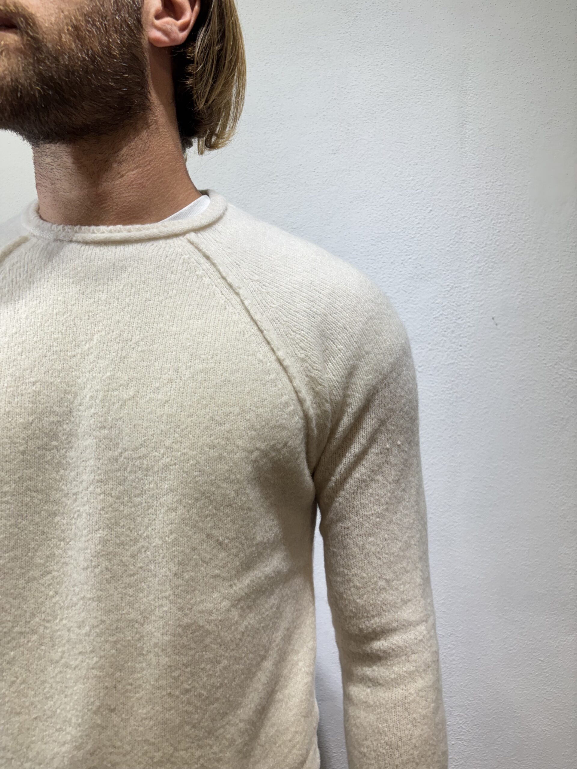 Alpha Studio girocollo in lana panna spalla raglanGirocollo in misto lana con spalla raglan colore panna, con taglio vivo Vestibilità slim Composizione 80% lana vergine 20% poliammide Made in Italy Il modello veste una taglia Media 48 italiana Altezza modello 1,81 peso 78 kg