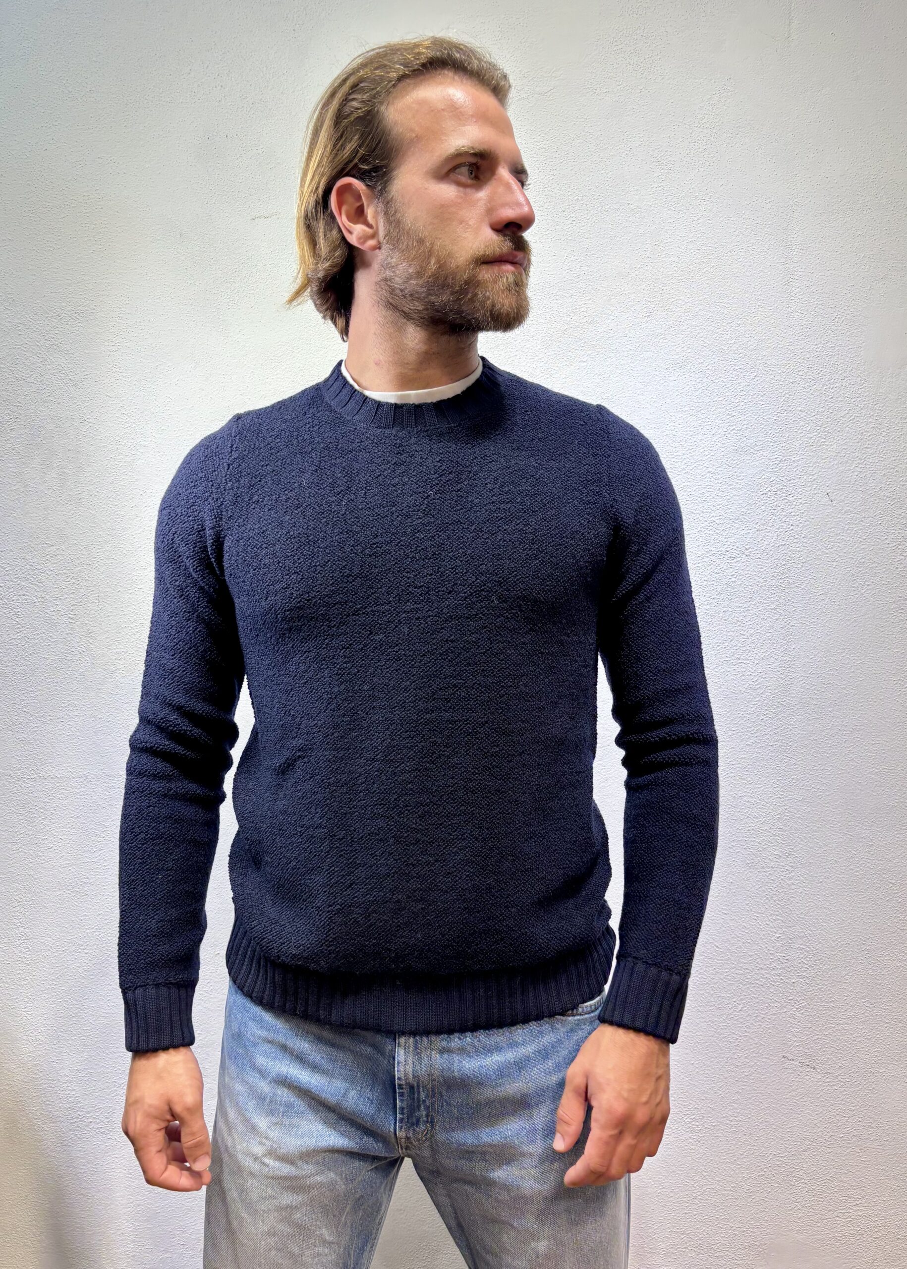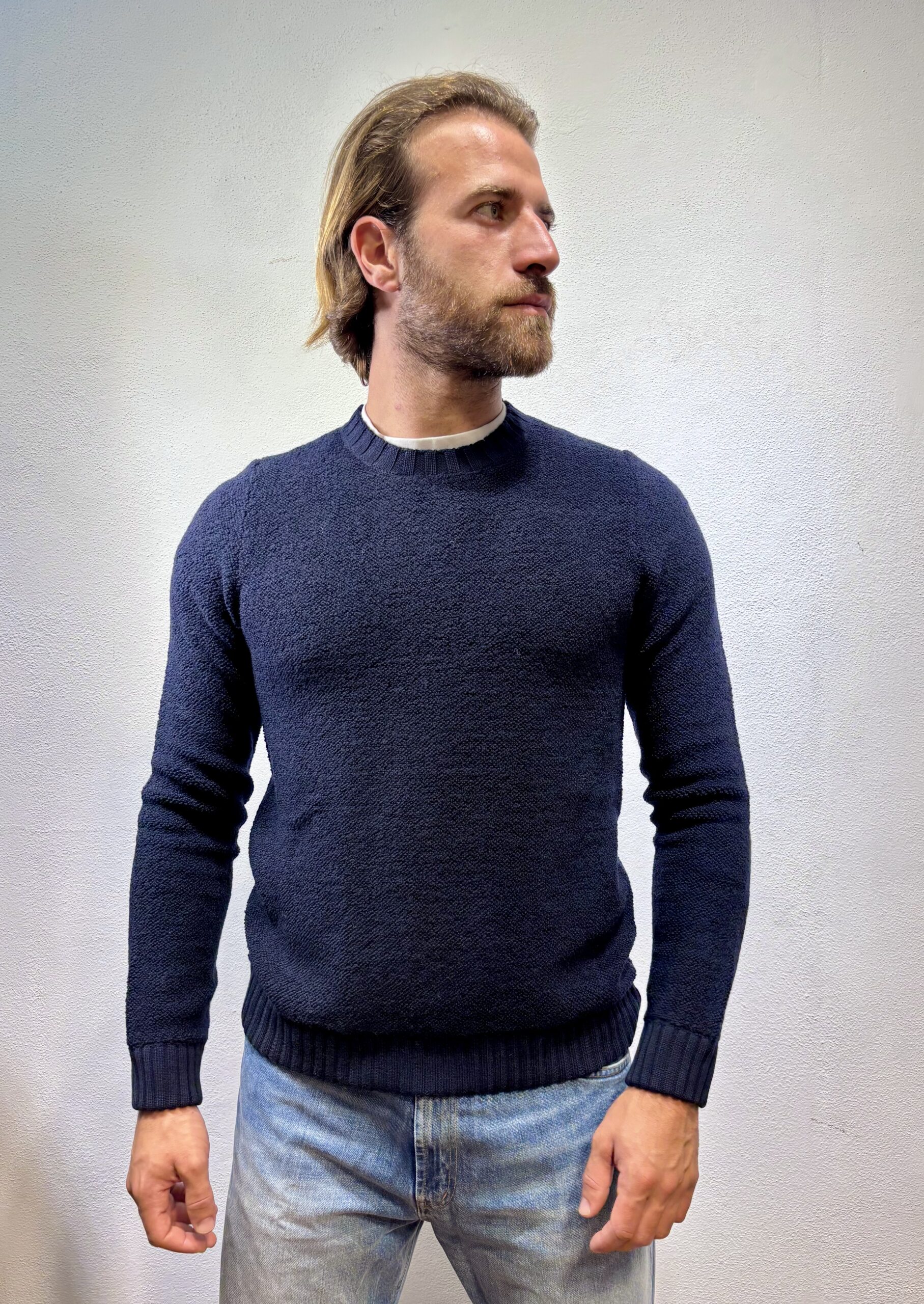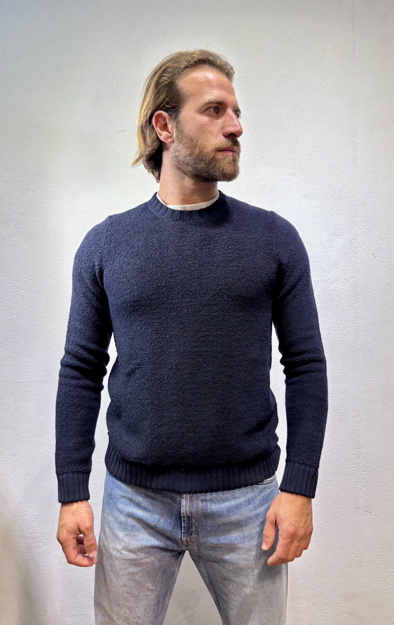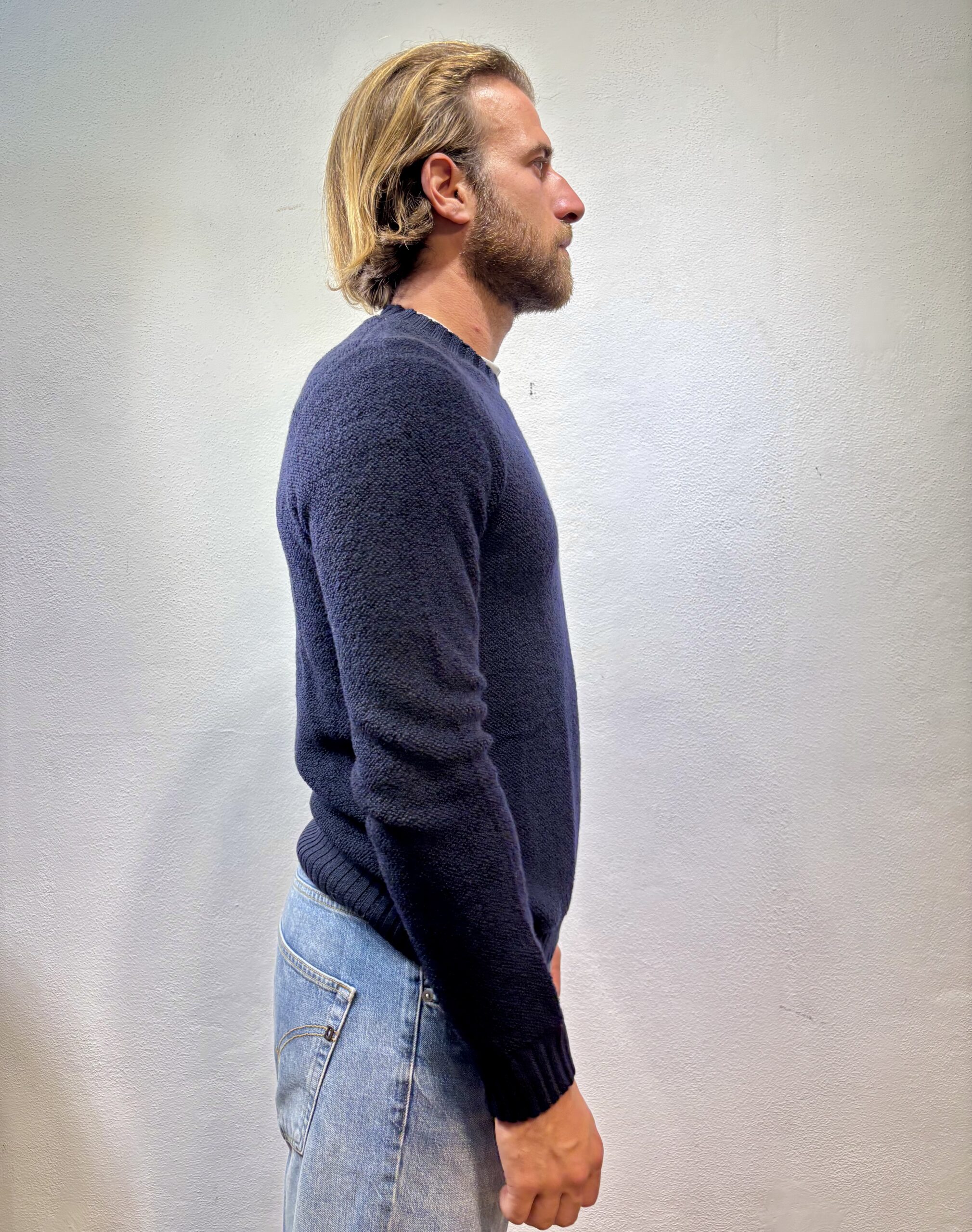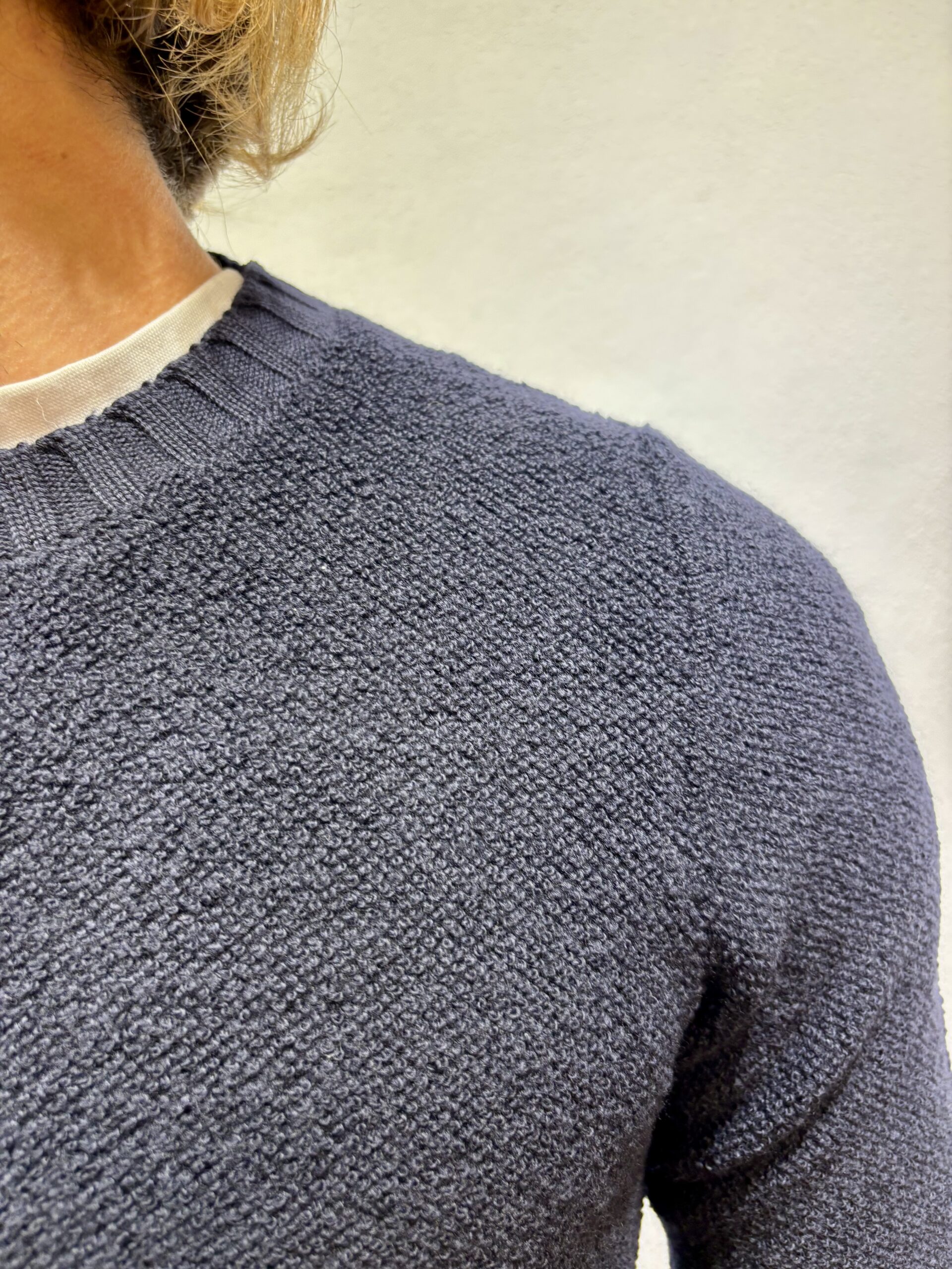 Alpha Studio girocollo effetto spugna blu AU3190C 1001 GIROCOLLO LAVORATO BLUGirocollo misto lana Composizione: 100% lana merinos Made in Italy Il modello veste una taglia Media 48 italiana Altezza modello 1,81 peso 78 kg