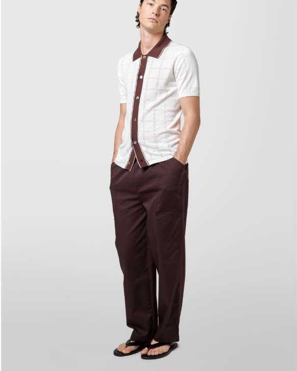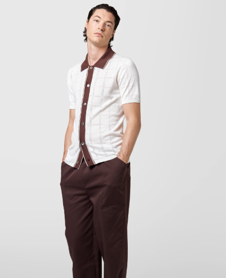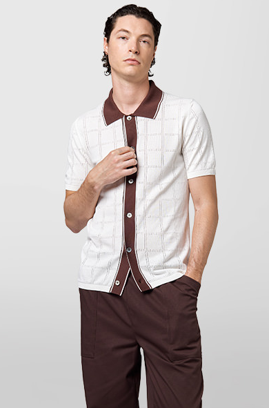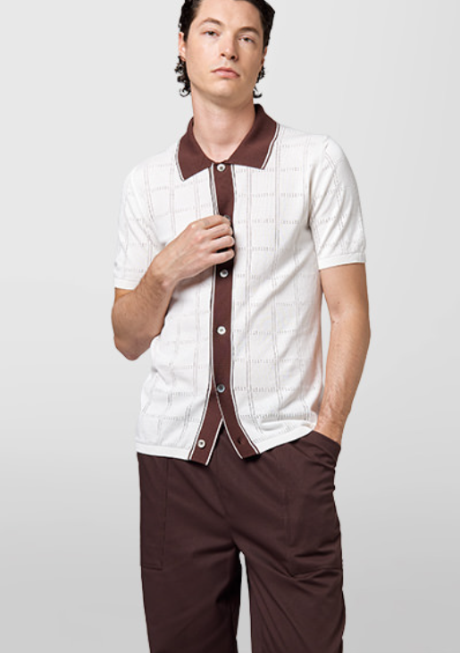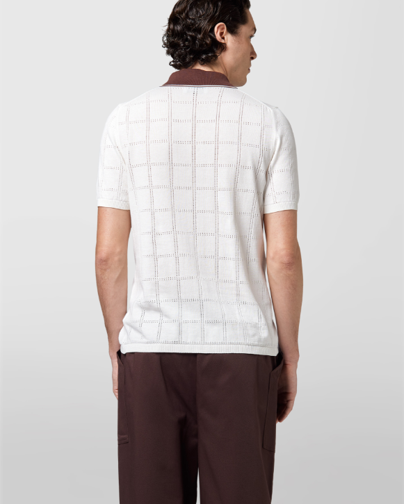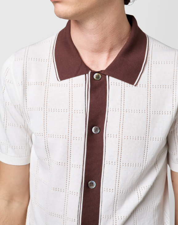 Alpha Studio polo camicia bicolore in cotone traforato panna Polo camicia mezza manica in filo di cotone con costrasto dal colletto al cannoncino centrale. 100% cotone Il modello veste una taglia M /48 Altezza Modello 1,85 peso 72 kg Vestibilità regolare