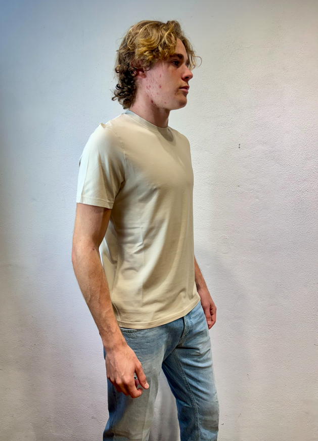 Alpha studio t-shirt mezza manica in cotone ”ice cotton” corda T-SHIRT REGULAR FIT 98% COTONE 2% ELASTAN AU5330C 1016 T-SHIRT ICE COTTON CORDA Il modello veste una taglia M /48 Altezza Modello 1,85 peso 72 kg Vestibilità slim Made in EU