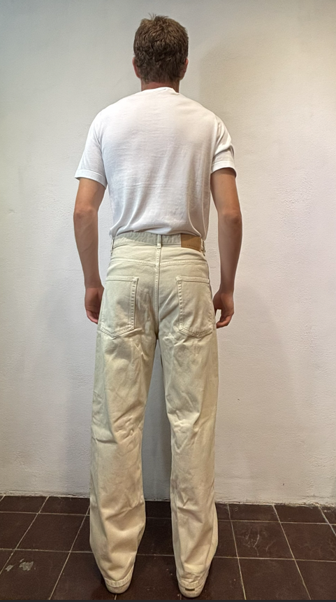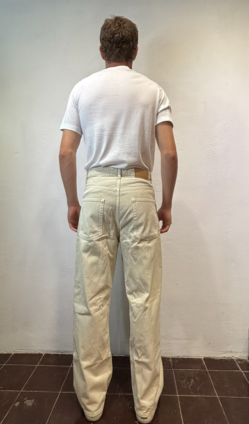 Amaranto Jeans baggy bull ecru Jeans tela denim fermo 100% cotone fondo 23 cm Il modello veste una taglia M /48 Altezza Modello 1,85 peso 72 kg