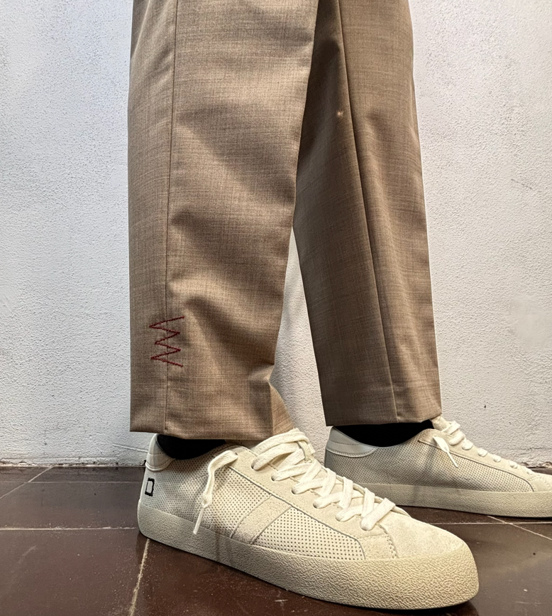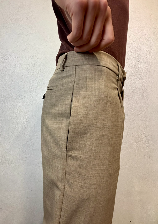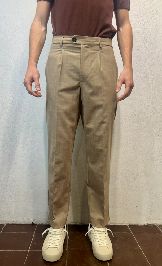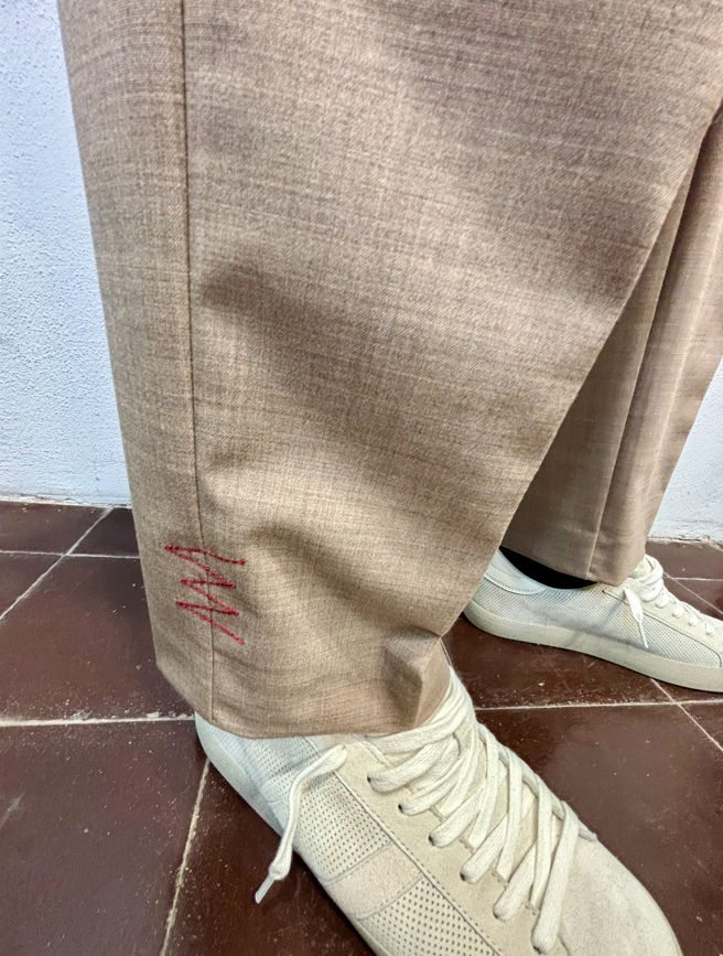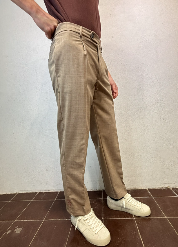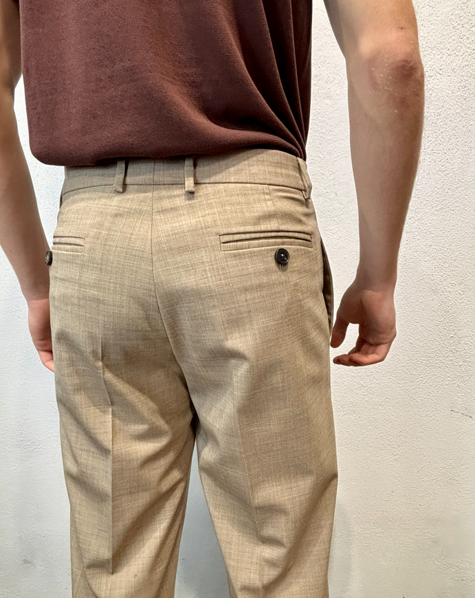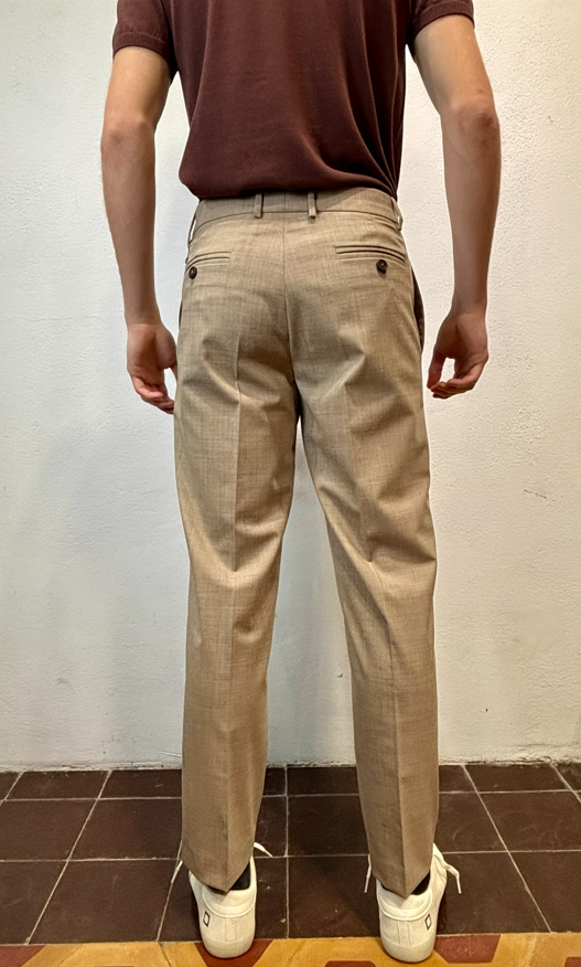 Amarnato pantalone in misto lana sabbia Pantalone con pinces, bottoni e zip, misto lana. Vestibilità regolare che scende sulla gamba fino in fondo, senza stringere. Il modello veste una taglia M /48 Altezza Modello 1,85 peso 72 kg Vestibilità regolare Composizione 44 % lana 2% elastan 54% poliestere Made in italy