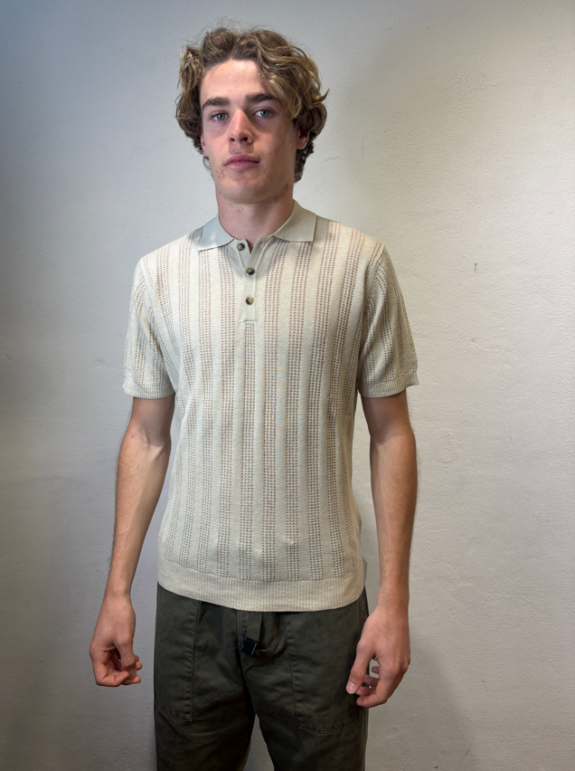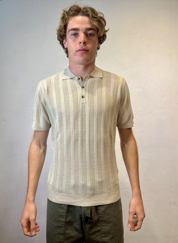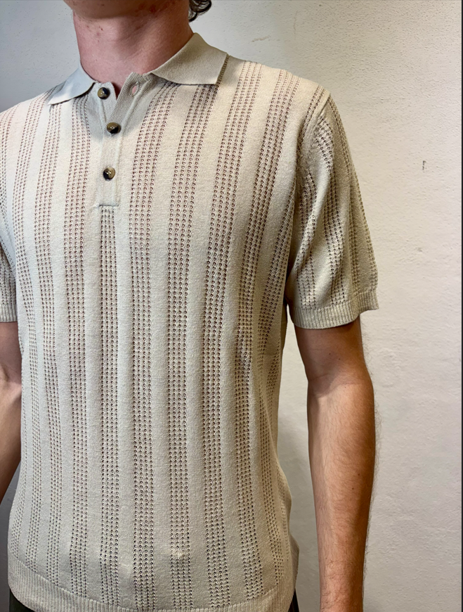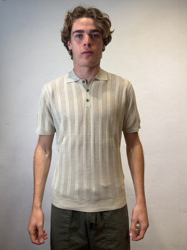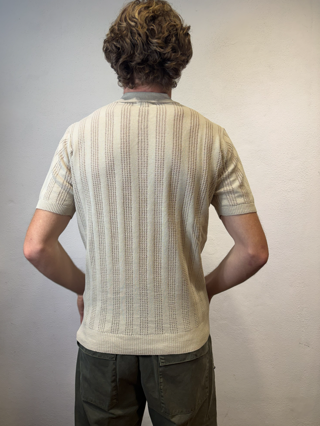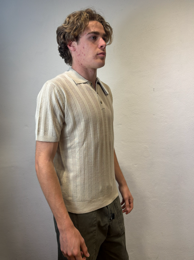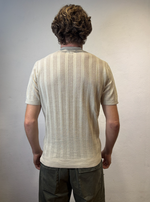 Polo mezza manica lavorato in misto lino Mastice Polo mezza manica lavorata traforato Composizione 55% lino 45% cotone Vestibilità Slim Altezza modello 1.86 peso 72 kg Il modello veste una taglia Media