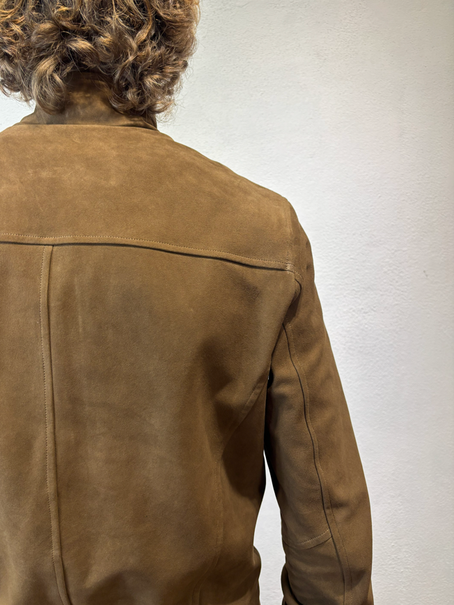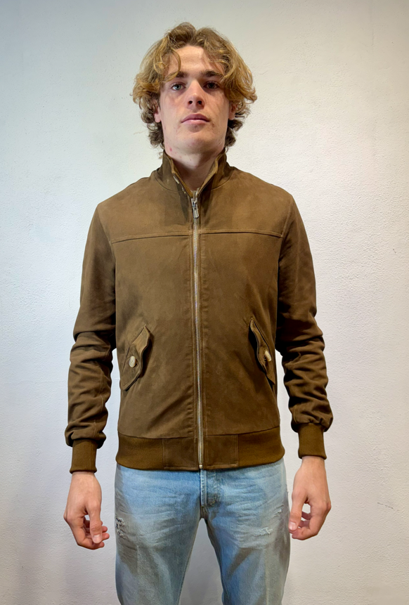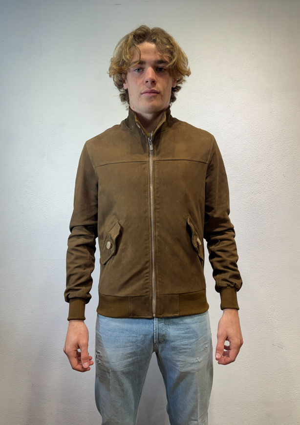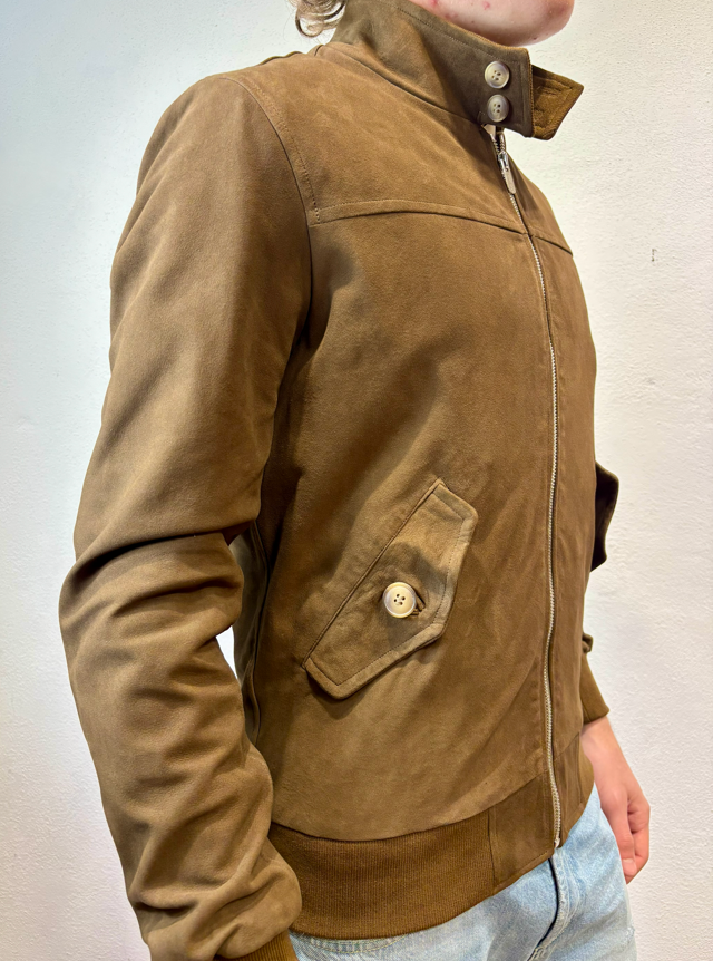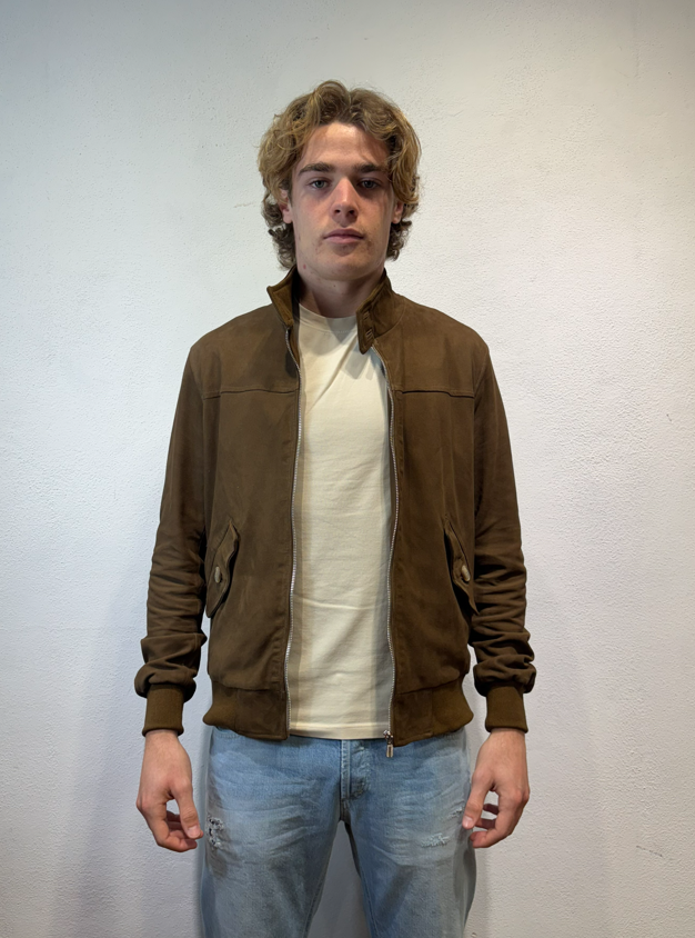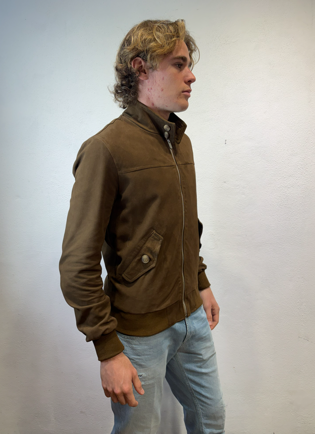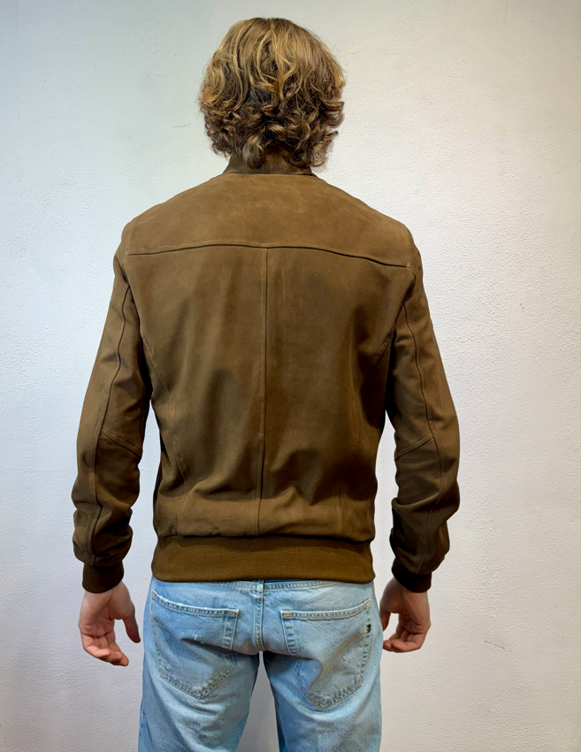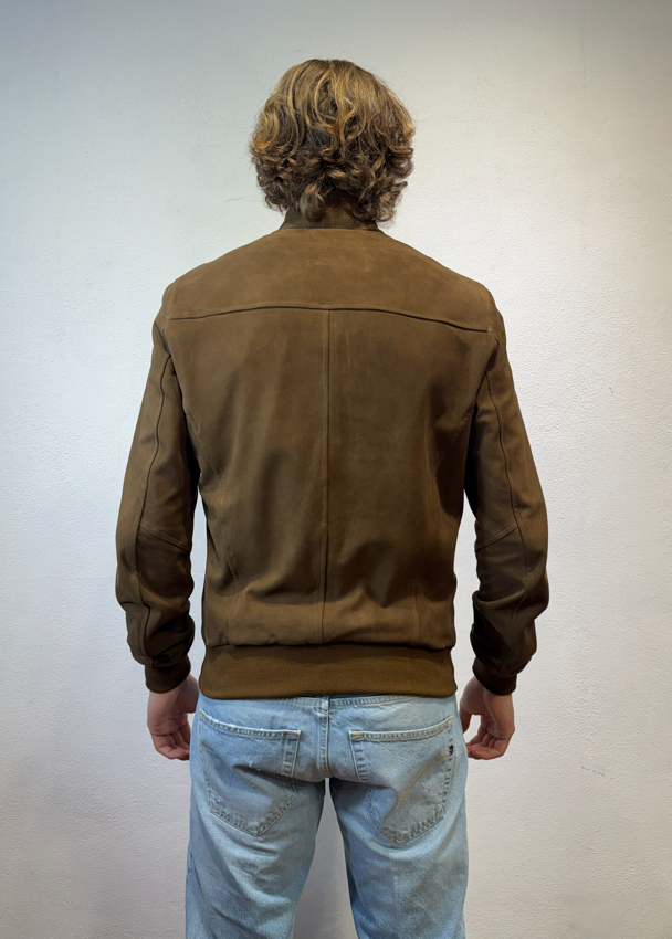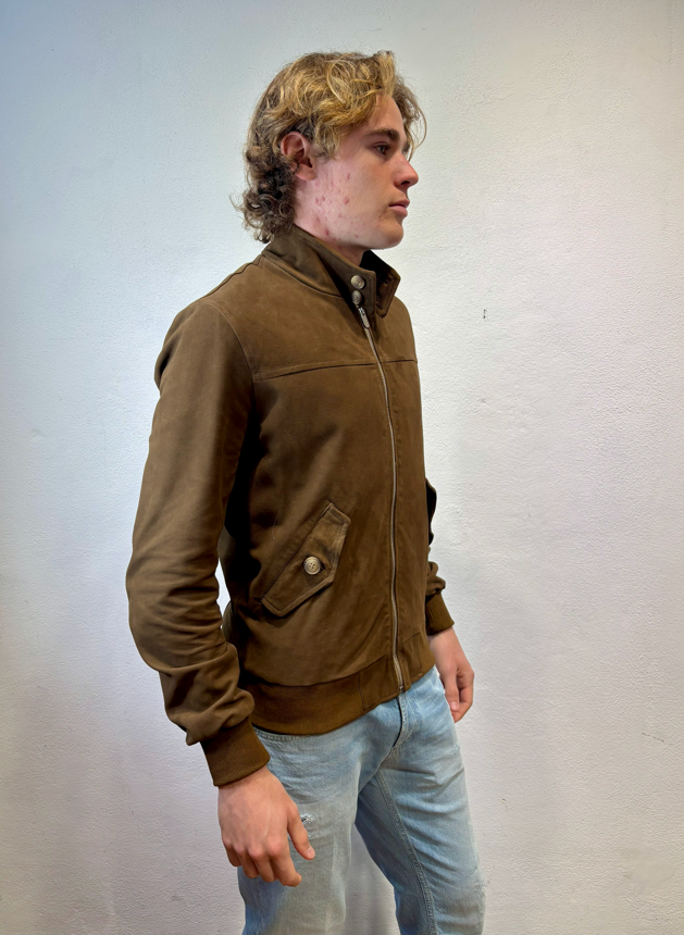 Blusotto bomber in camoscio con zip moro Bomber in camoscio con zip, polsino al collo ed alle maniche. 100% pelle (camoscio) fodera 90% cotone 10% lino BJON P346 CAMOSCIO VALSTAR COLLO IN PIEDI MORO Made in TOSCANA Il modello veste una taglia M /48 Altezza Modello 1,85 peso 72 kg Vestibilità regolare