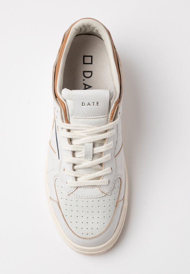 D.A.T.E Toreno colored bianco blu e caramello Sneakers bassa in pelle martellata colore bianco e suede in tono. Dettagli & Vestibilità La punta è traforata per una maggiore traspirabilità. Sulla linguetta è cucita la label in pelle martellata con logo D.A.T.E. I lacci sono in cotone e il logo quadrato è impresso lateralmente. Il collare è in pelle colore cuoio. Il nome del modello è impresso sul retro. Fodera in pelle e spugna di cotone. Il soletto interno è rialzato di 2.5 cm per un migliore comfort. Il logo quadrato e la scritta D.A.T.E. sono in rilievo sulla suola. La suola in gomma, alta 2.5 – 3.5 cm, è cucita. Tutti i materiali selezionati sono Made in Italy. Vestibilità: REGULAR Codice: M441-TO-CO-WL Istruzioni per la cura Raccomandiamo di seguire alcune istruzioni per preservare queste sneakers: Evitare il contatto con acqua, sostanze contenenti alcol e in generale qualsiasi prodotto abrasivo. In caso di contatto con l’acqua, è fondamentale lasciare che le sneakers si asciughino completamente prima di procedere alla pulizia. Pulire la pelle liscia o martellata con un panno morbido e umido. Quando la pelle sarà completamente asciutta, applicare della crema neutra e del lucido di buona qualità con un panno morbido, eseguendo piccoli movimenti circolari. Per pulire le parti in suede utilizzare una spazzola asciutta a setole morbide e spazzolare con attenzione le singole parti in suede.