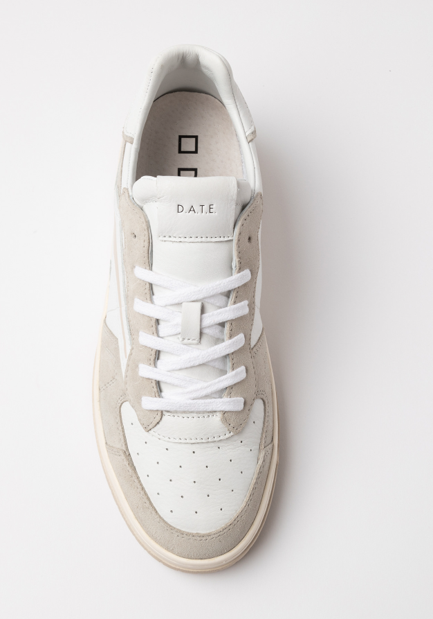 D.A.T.E Sneakers ”torneo pure” basic bianco beige Sneakers bassa in pelle colore bianco e suede beige. Dettagli & Vestibilità La punta è traforata per una maggiore traspirabilità. Sulla linguetta è cucita la label in pelle con logo D.A.T.E. I lacci sono in cotone e il logo quadrato è impresso lateralmente. Il talloncino è in pelle colore bianco. Il nome del modello è impresso sul retro. Fodera in pelle e spugna di cotone. Il soletto interno è rialzato di 2.5 cm per un migliore comfort. Il logo quadrato e la scritta D.A.T.E. sono in rilievo sulla suola. La suola in gomma, alta 2.5 – 3.5 cm, è cucita. Tutti i materiali selezionati sono Made in Italy. Vestibilità: REGULAR Codice: M441-TP-BA-HB Istruzioni per la cura Raccomandiamo di seguire alcune istruzioni per preservare queste sneakers: Evitare il contatto con acqua, sostanze contenenti alcol e in generale qualsiasi prodotto abrasivo. In caso di contatto con l’acqua, è fondamentale lasciare che le sneakers si asciughino completamente prima di procedere alla pulizia. Pulire la pelle liscia o martellata con un panno morbido e umido. Quando la pelle sarà completamente asciutta, applicare della crema neutra e del lucido di buona qualità con un panno morbido, eseguendo piccoli movimenti circolari. Per pulire le parti in suede utilizzare una spazzola asciutta a setole morbide e spazzolare con attenzione le singole parti in suede.