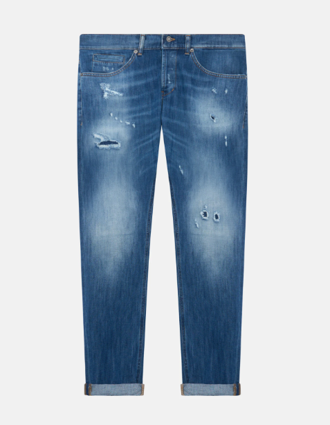 Dondup jeans Brighton lavagigo merdio con strappi ricuciti Jeans Britghton cinque tasche regular fit, vita regolare. Denim stretch cross blu 12 1/2 oz. Lavaggio medio strappato. Logo Dondup. Made in Italy Specifiche tecniche Codice articolo UP434 DS010 LE8 DU W25 800 Colore Blu Materiale 98% Cotone 2% elastan Altezza modello 187 cm Taglia modello 32 UP434 DS010 LE8 BRIGHTON STRAPPO DENIM