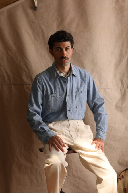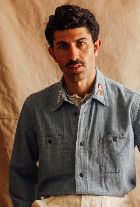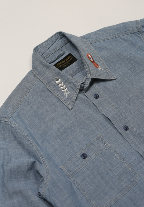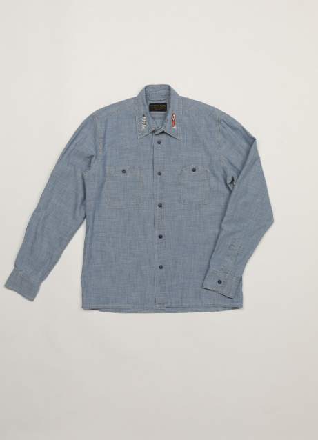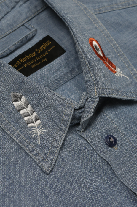 East Harbour Surplus camicia in chambry con ricami Camicia da lavoro Chambray lavato in pietra 100% cotone Prodotto in Italia KODAK 475 CHAMBRY CAMICIA DENIM