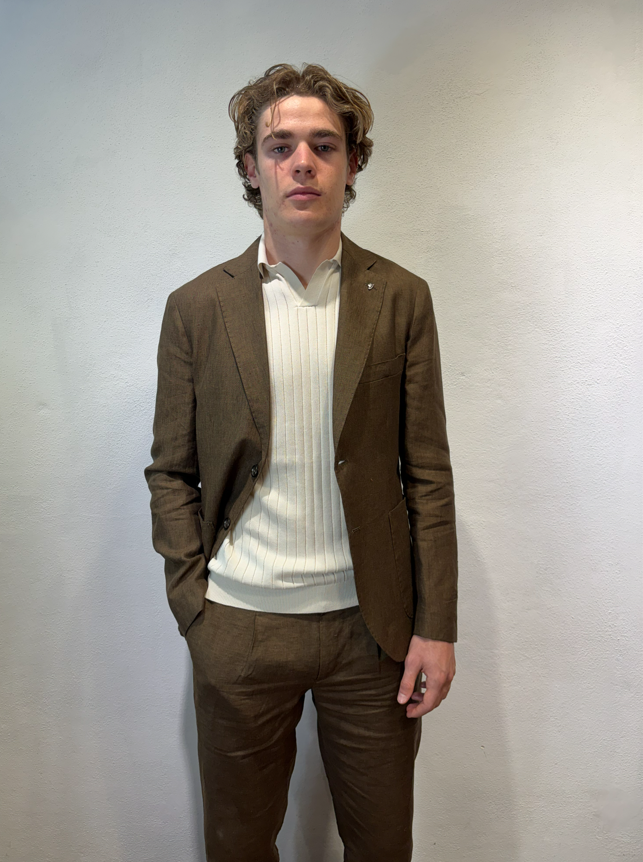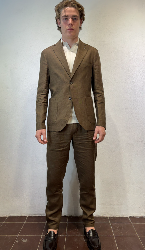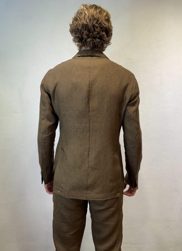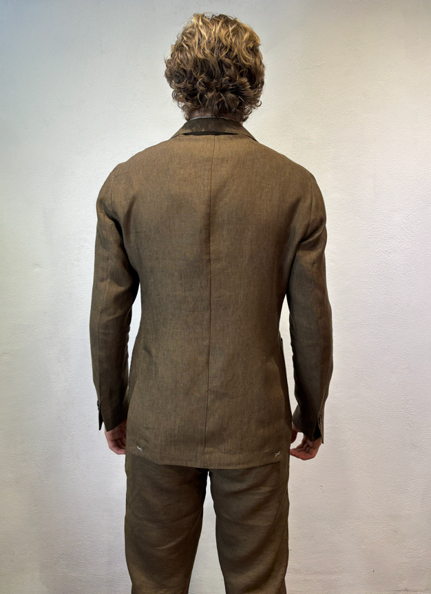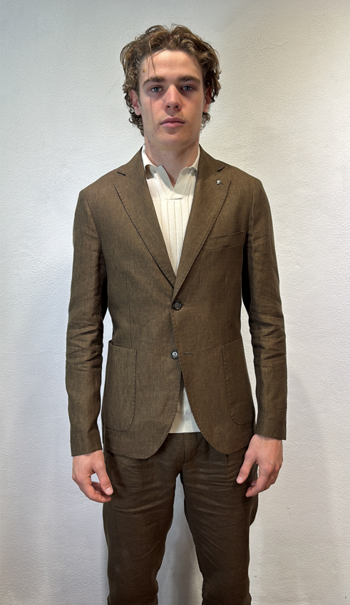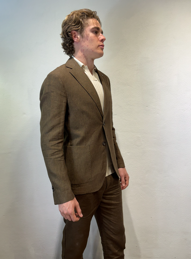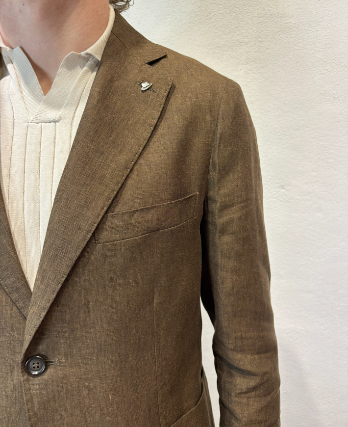En Avance giacca in lino cioccolato Giacca monopetto con tasca a toppa composizione 100% lino Made in italy Il modello veste una taglia M /48 Altezza Modello 1,85 peso 72 kg