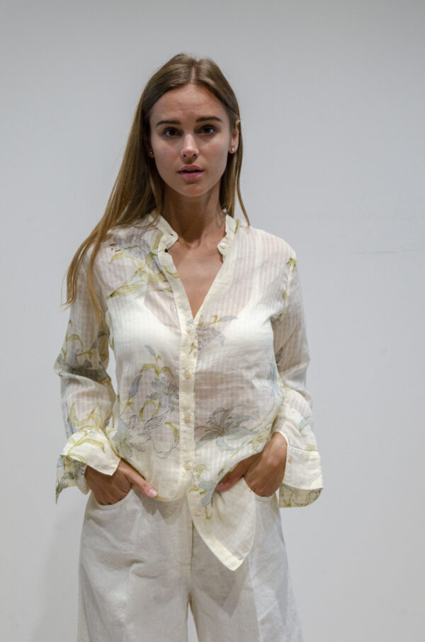 FORTE FORTE – camicia in seta con stampa ibiscus colore Avorio Camicia 100% seta con ricamo sul davanti 100% made in itlay La modella indossa una taglia 2 / medium /42 Altezza modella 1,76 cm peso 50 kg
