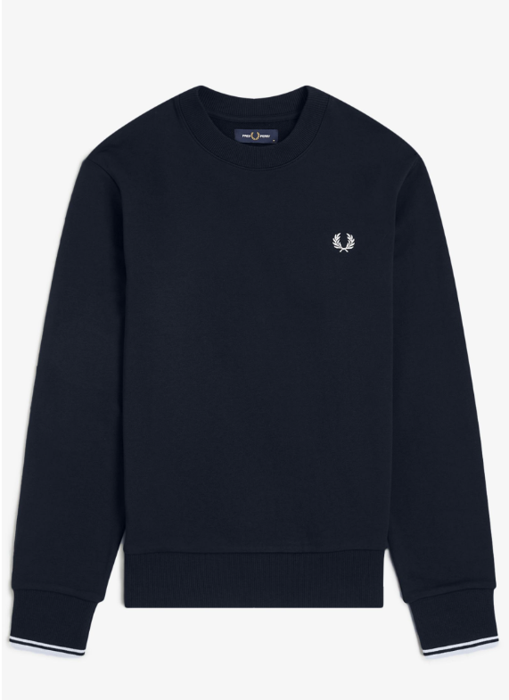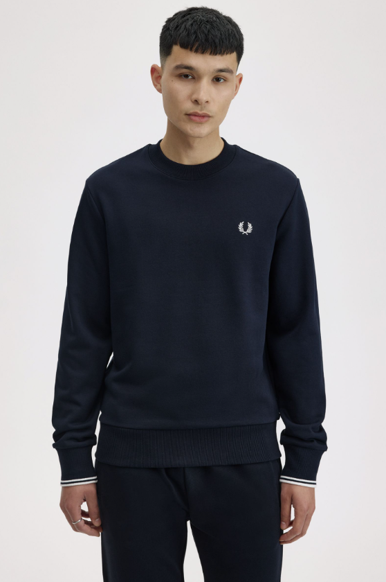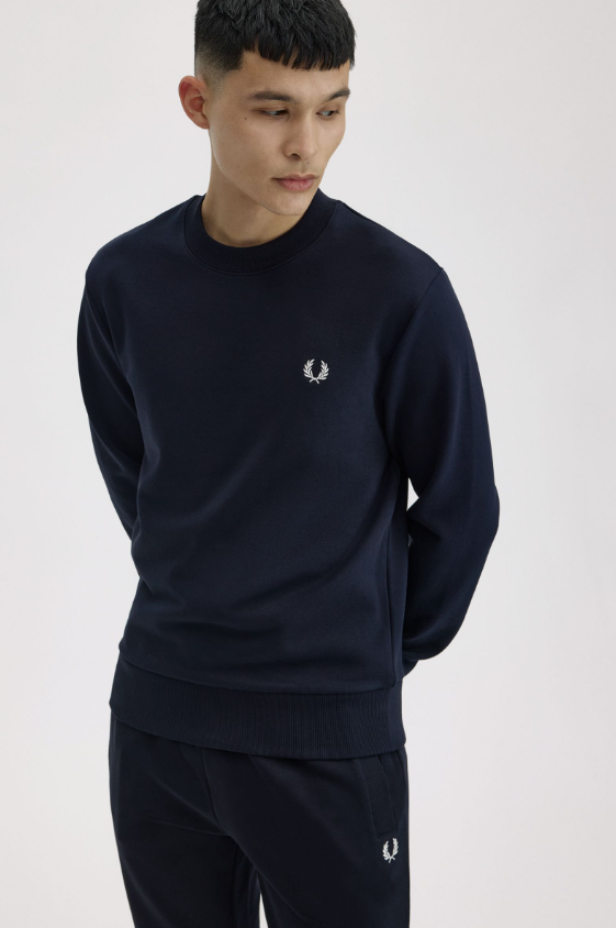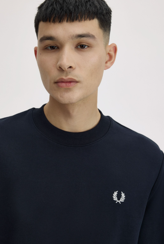 Fred Perry Felpa girocollo blu Felpa girocollo in misto cotone con rovescio a ricci. Definita da bordi a coste e polsini con doppia riga. Felpa misto cotone con rovescio a ricci / Vestibilità regular / Rifiniture a coste / Polsini con doppia riga Colore blu navy Ulteriori Informazioni Indossata dai giocatori durante gli allenamenti invernali, la felpa in cotone è un classico dello sportswear. La nostra è rifinita con discreti dettagli Fred Perry e doppia riga sui polsini. 100% Cotone Lavare In Lavatrice Altezza modello/a: 6’1.5′ / 187cm Il/La modello/a indossa: M Modello M7535 Colore Blu Navy