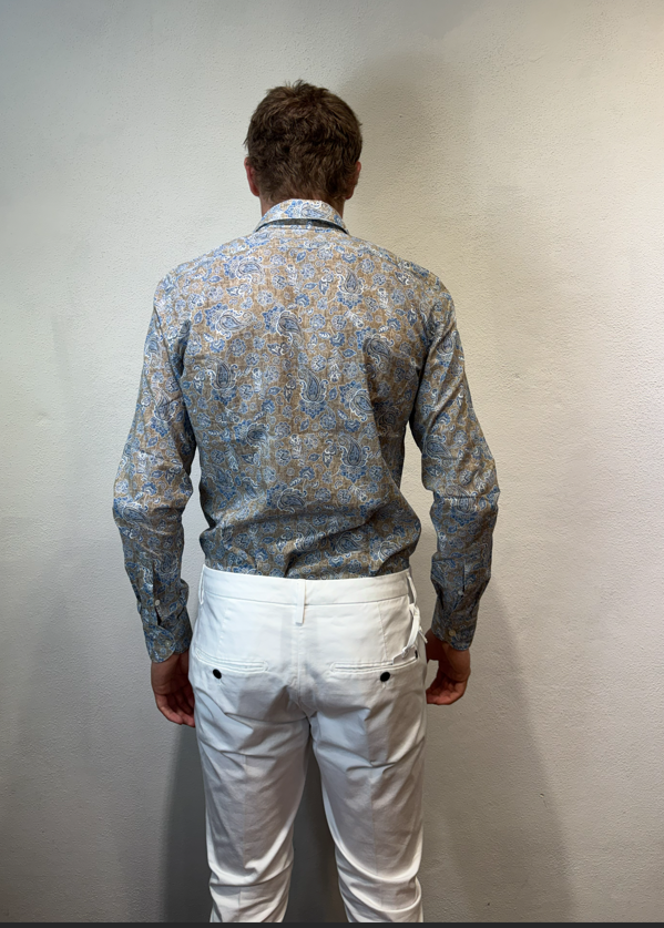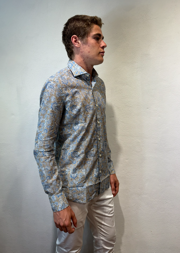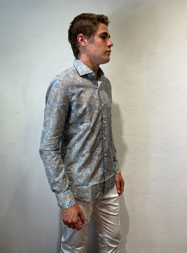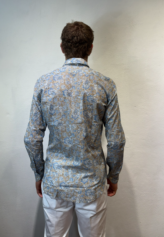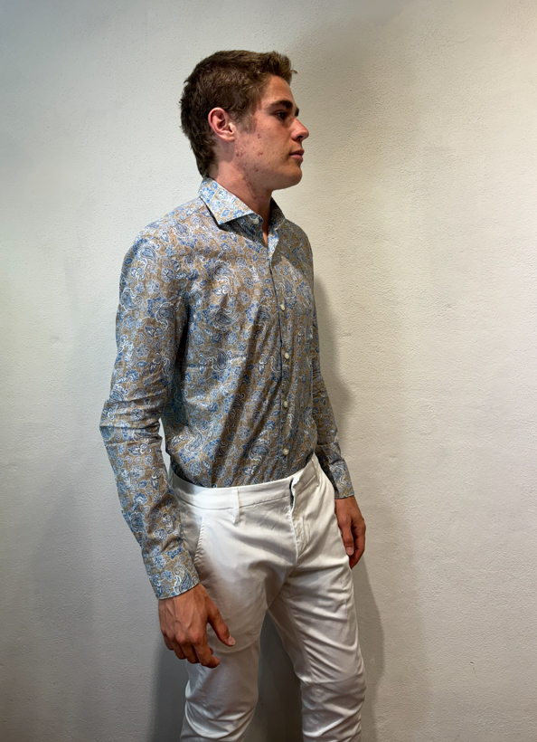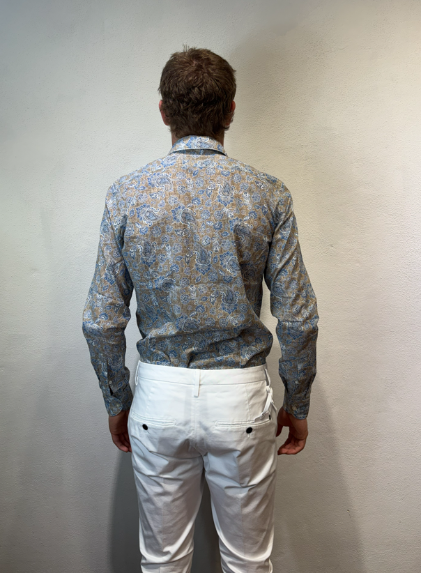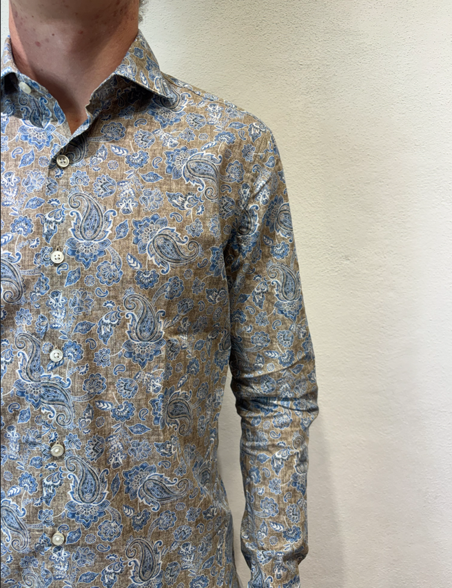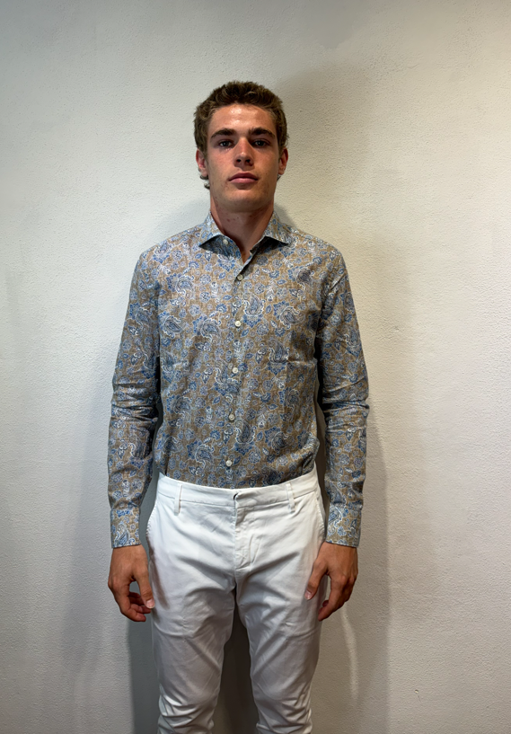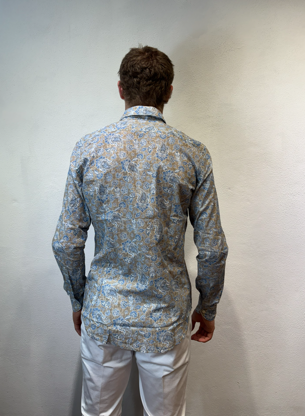 Ghr camicia in lino e cotone fantasia disegno cachemire blu