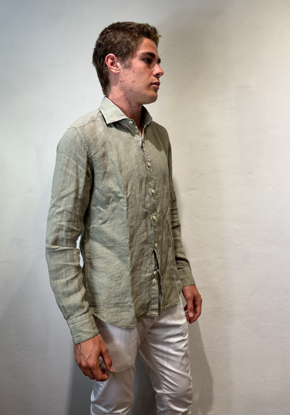 Ghr camicia in lino verde salvia TC162 L65 B878 215 CAMICIA LINO TORTORA Camicia vestibiltà regolare senza pinces Composizione 100% lino Il modello veste una taglia 39 / Media / 48 italiana Altezza Modello 1,85 peso 72 kg Made in tunisia