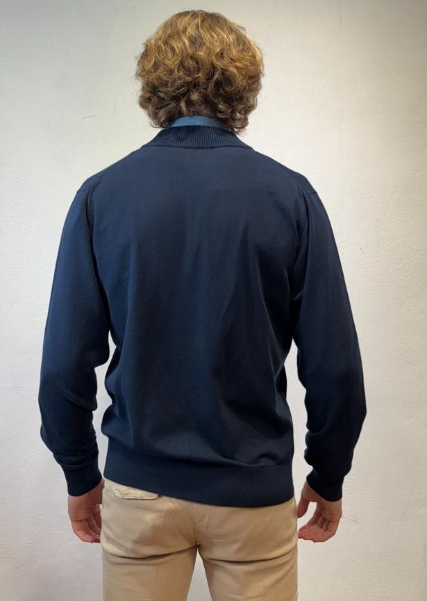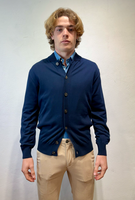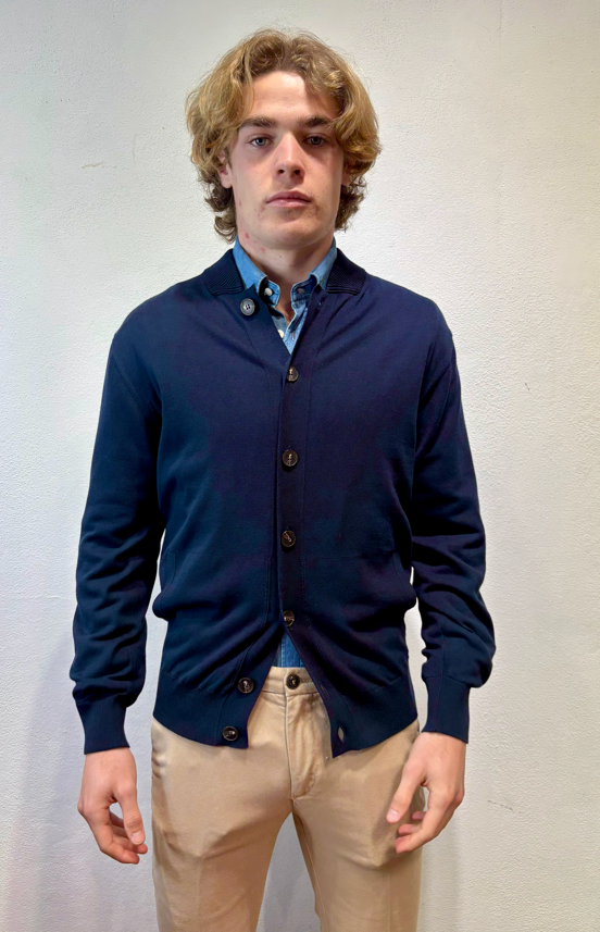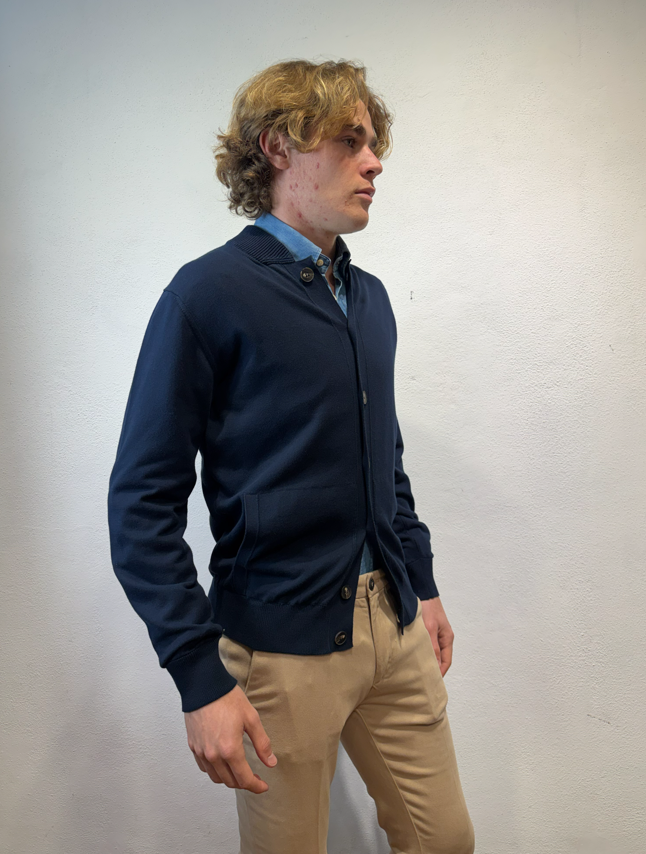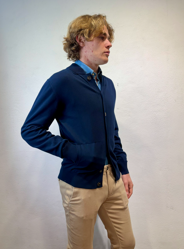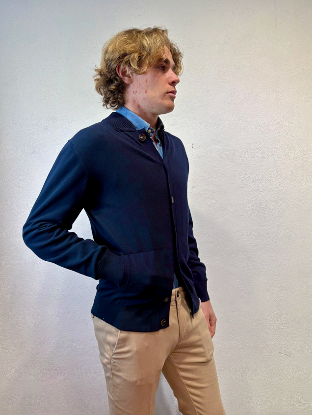 Kangra Giubbottino in maglia con bottoni Blu Giubbotto in maglia con tasche sul davanti. Chiusura fino al collo con bottoni. 100% cotone Il modello veste una taglia M /48 Altezza Modello 1,85 peso 72 kg Vestibilità regolare