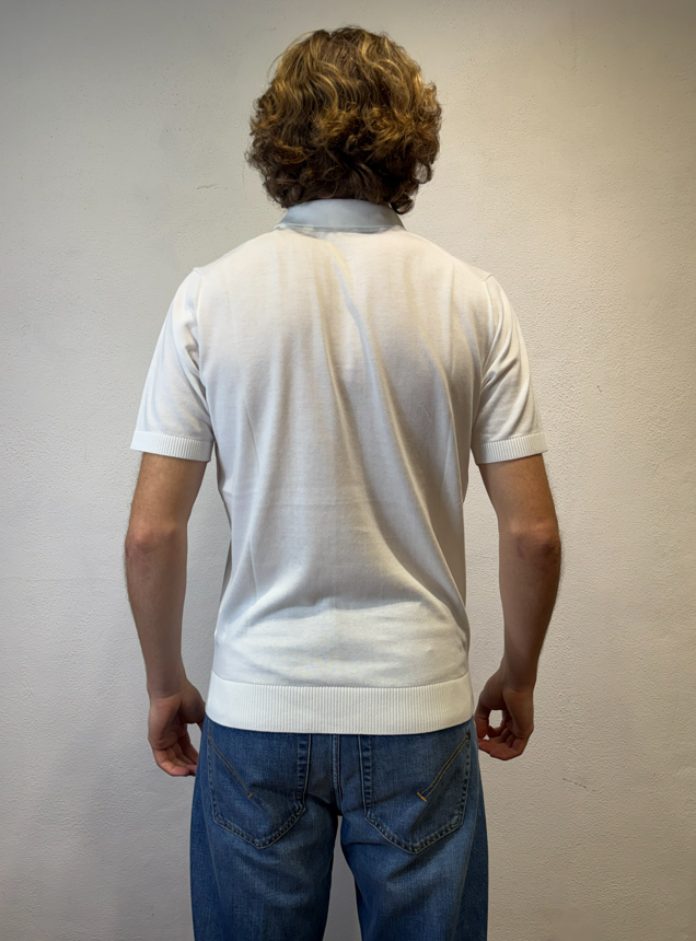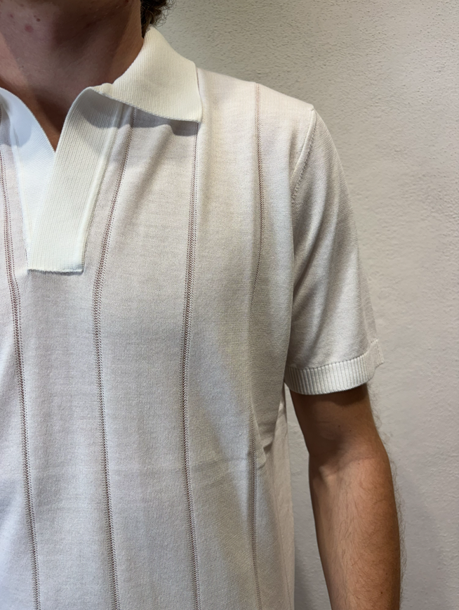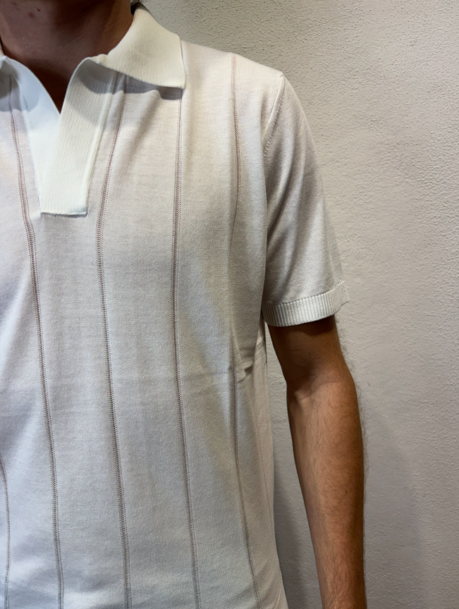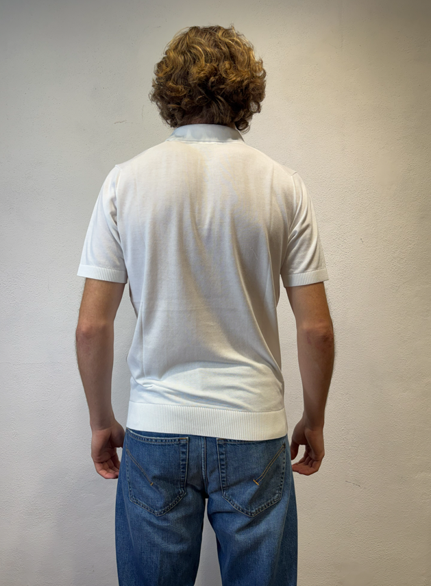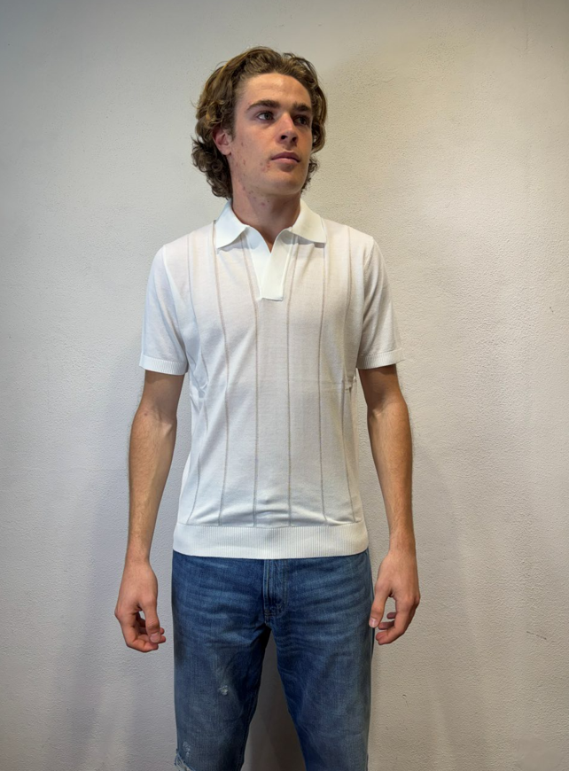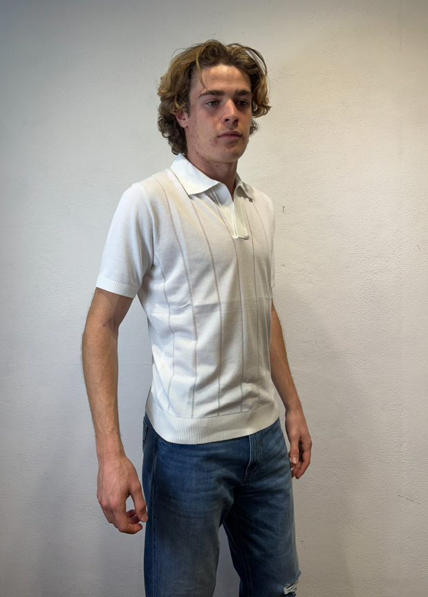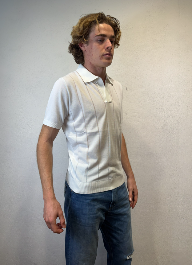 Kangra Polo scollo a V lavorazione punto catenella panna Maglia con collo a polo manica corta lavorazione punto catenella Polo uomo a manica corta in puro cotone, caratterizzata da lavorazione a coste sfalzate sul davanti che crea un raffinato effetto materico e movimento sulla superficie. La struttura rimane leggera e traspirante, ideale per la stagione primavera/estate. Il design senza bottoni dona un’estetica essenziale e contemporanea, mentre le finiture dritte definiscono il capo con pulizia e precisione. Una polo in maglia dal carattere distintivo, perfetta sia in abbinamento casual sia sotto una giacca destrutturata. Il modello veste una taglia M /48 Altezza Modello 1,85 peso 72 kg Vestibilità regolare 3016 23 01 POLO V P.CATENELLA BIANCO