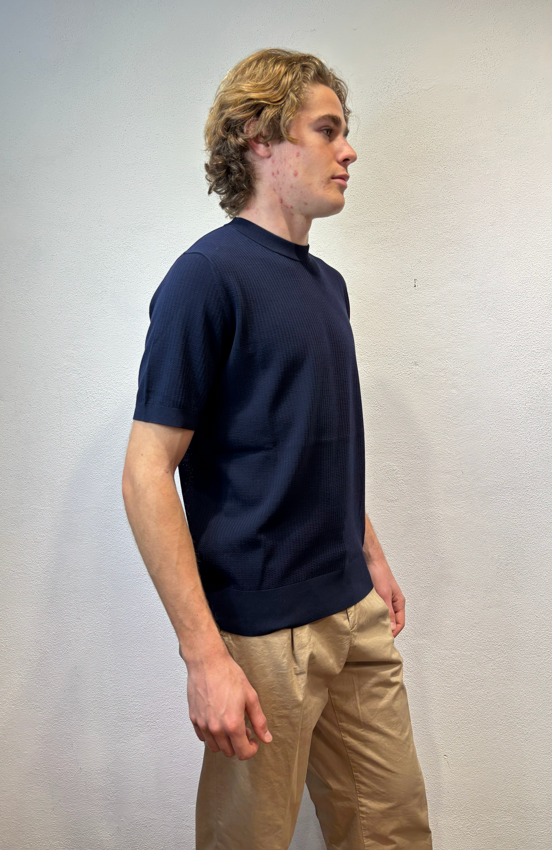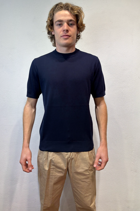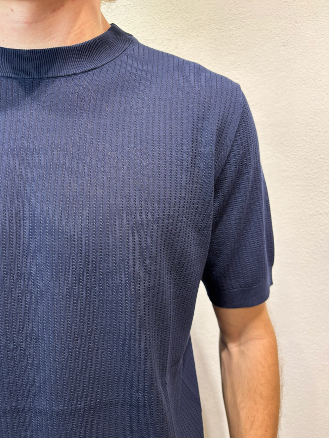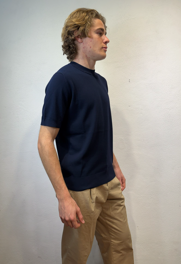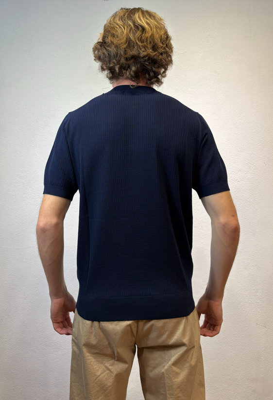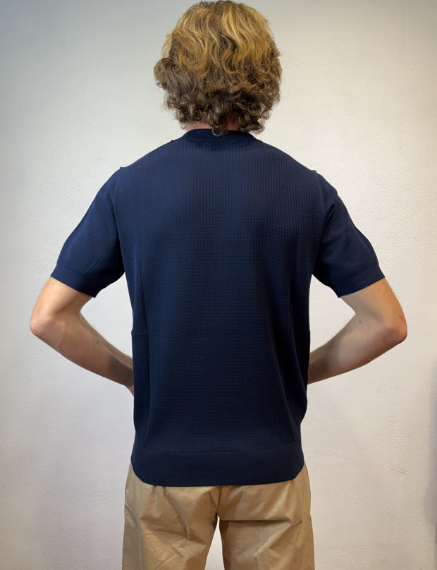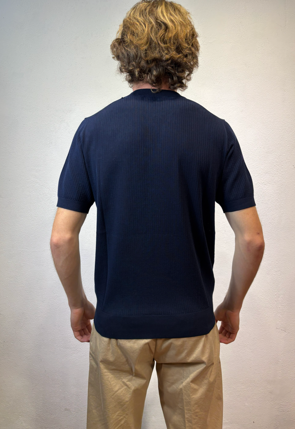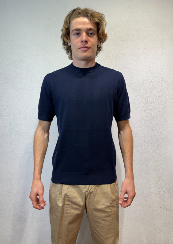 Kangra t-shirt con lavorazione punto catenella blu Maglia girocollo a manica corta lavorazione punto catenella T-shirt uomo a manica corta in puro cotone, caratterizzata da lavorazione a coste sfalzate sul davanti che crea un raffinato effetto materico e movimento sulla superficie. La struttura rimane leggera e traspirante, ideale per la stagione primavera/estate. Il design senza bottoni dona un’estetica essenziale e contemporanea, mentre le finiture dritte definiscono il capo con pulizia e precisione. Una polo in maglia dal carattere distintivo, perfetta sia in abbinamento casual sia sotto una giacca destrutturata. Il modello veste una taglia M /48 Altezza Modello 1,85 peso 72 kg Vestibilità regolare 3023 21 38 T-SHIRT P.CATENELLA BLU