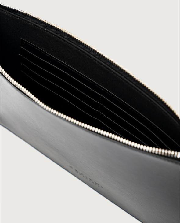 Orciani Busta pocket NoBuckle Alba in pelle con polsiera nero ANB003-A-_ALB-ALBALLNER Dimensioni: Larghezza: 28 cm / Altezza: 17 cm Tasche:otto scomparti interni porta carte Chiusura: zip Funzionalità: protezione RFID anti-frode Materiale: pelle di vitello liscia Dettagli: metallerie finitura palladio Made in Italy