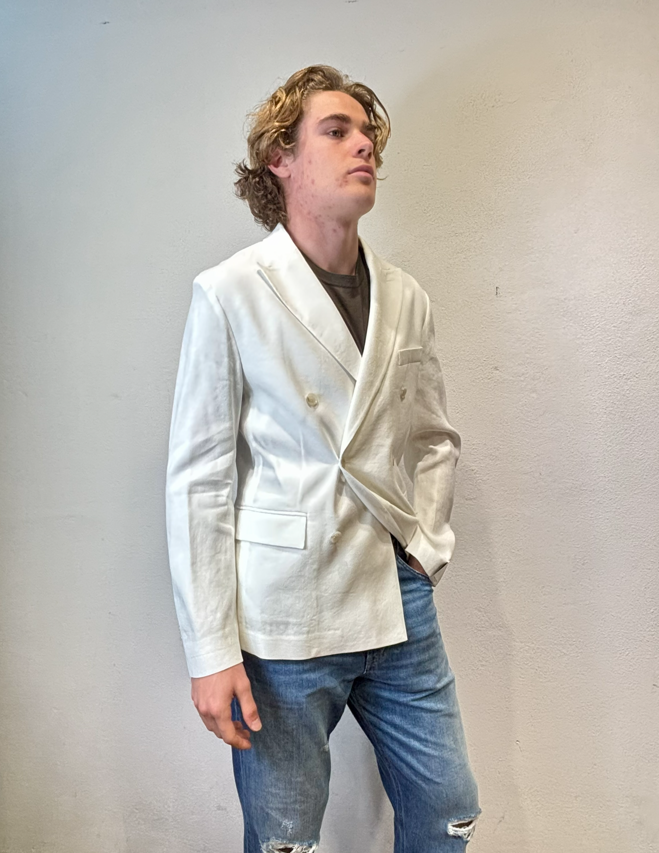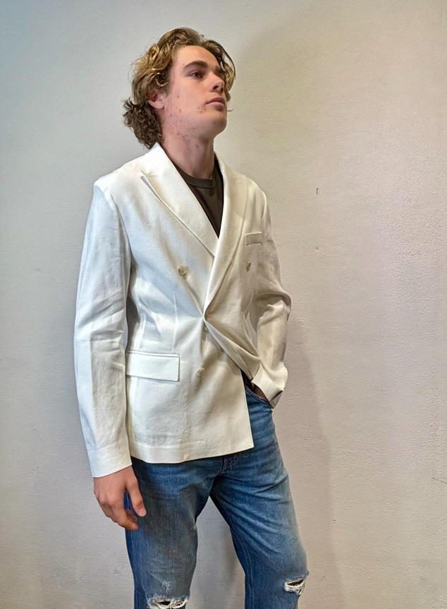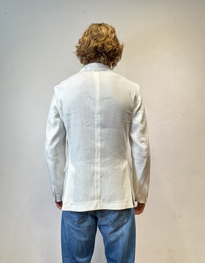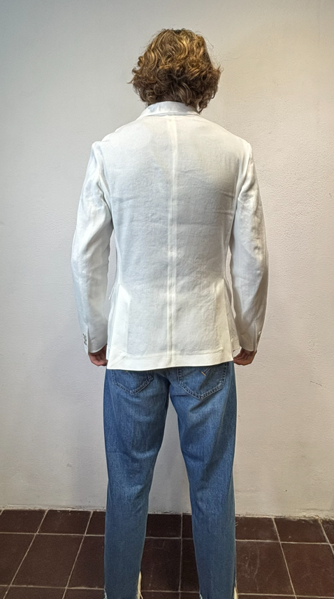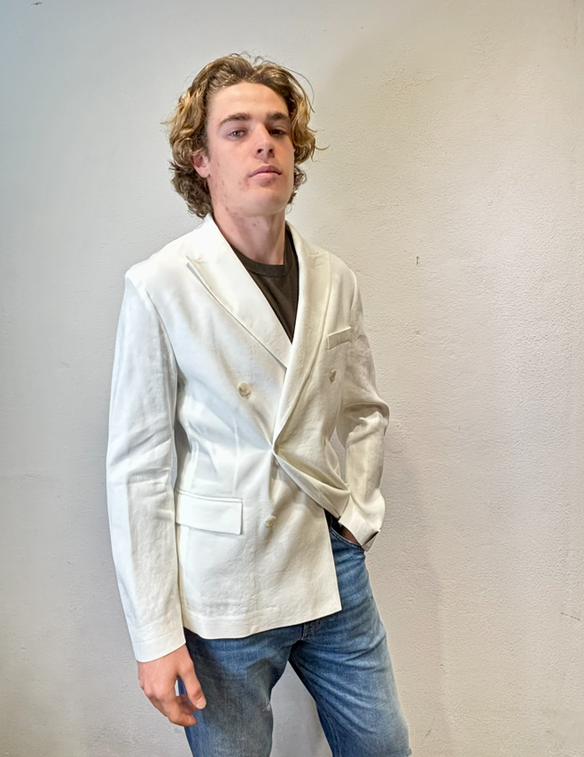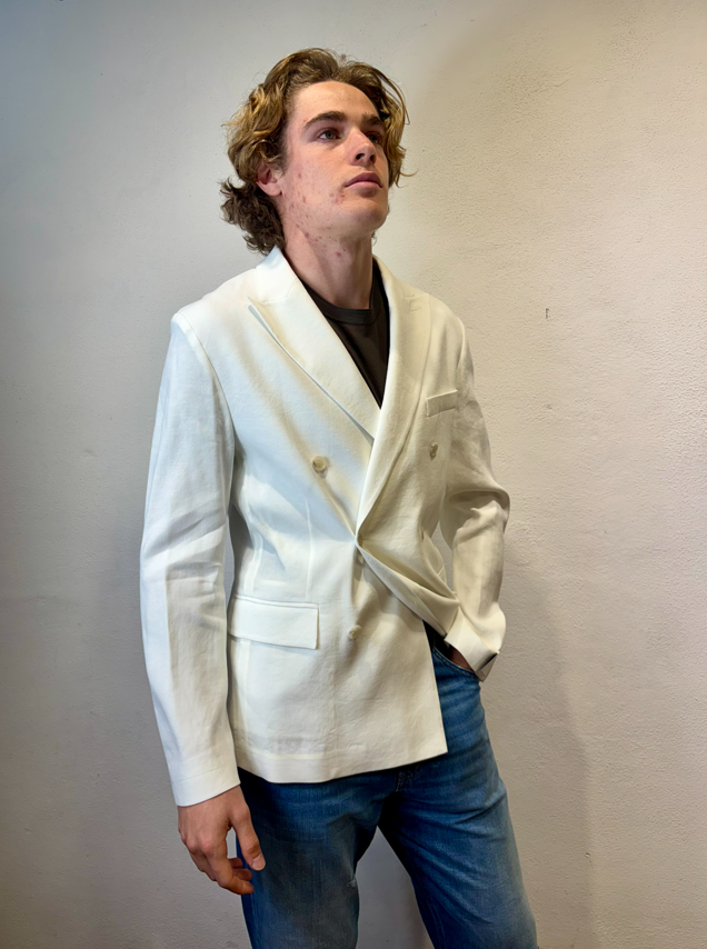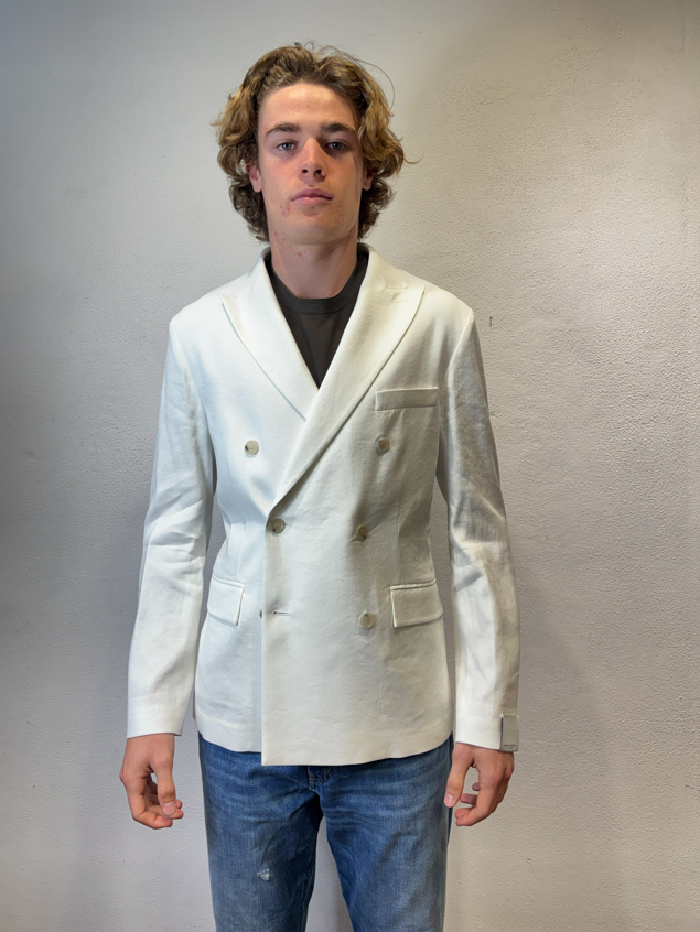 Paolo Pecora giacca doppio petto cotone lino panna Giacca doppio petto in misto lino e cotone con tasca a pattina Made in Italia composizione 56% lino 42% cotone 2% elastan Il modello veste una taglia 46 Altezza modello 1,85 peso 72 kg