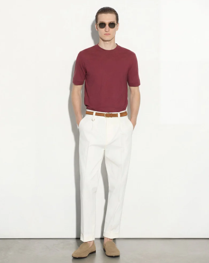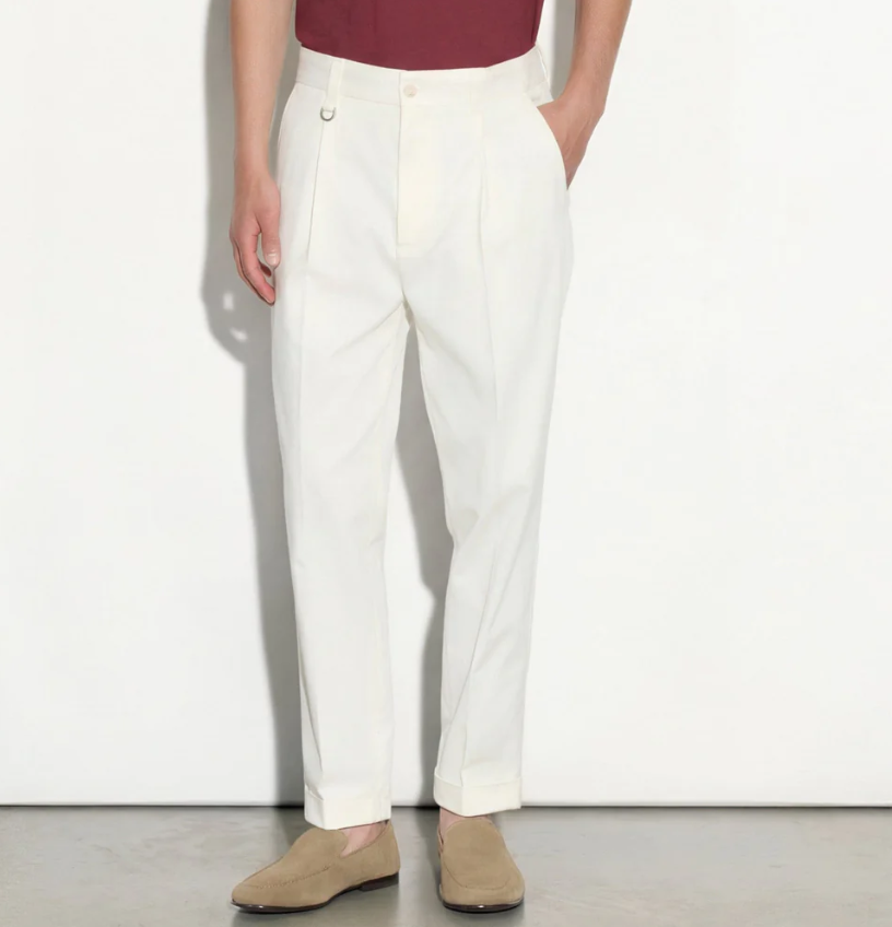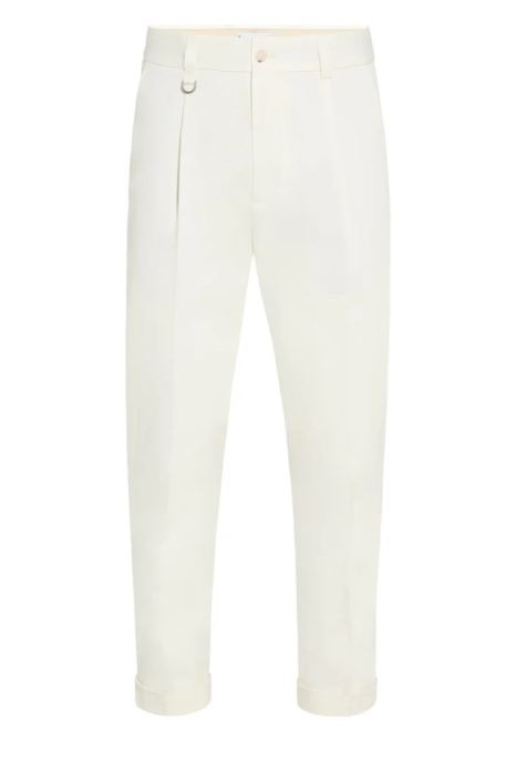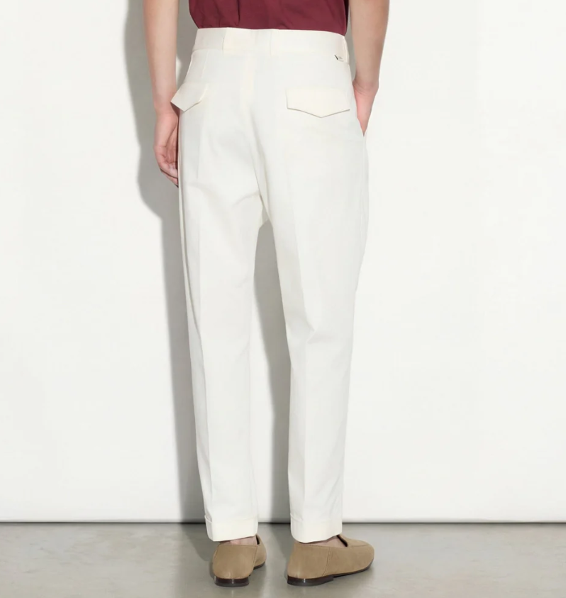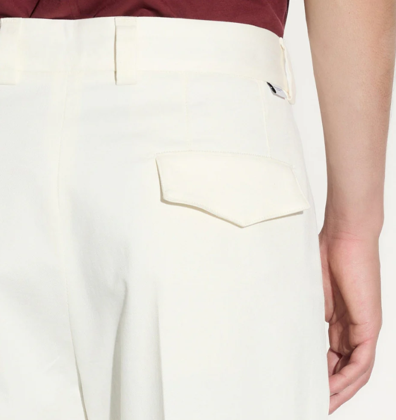 Paolo pecora pantalone in gabardina con una pinces colore bianco Pantalone chino realizzato in cotone stretch, caratterizzato da una vestibilità relaxed che offre comfort e libertà di movimento senza rinunciare a una linea ordinata. Il design presenta pinces frontali, chiusura con bottone e zip, tasche laterali e tasche posteriori a filetto. Il colore panna valorizza l’estetica pulita del capo, rendendolo adatto sia a contesti quotidiani sia ad abbinamenti più curati. Caratteristiche • Designed and styled in Italy • Vestibilità Relaxed • Tessuto principale: 97%CO 3%EA • Pinces frontali • Risvolto al fondo • Tasche laterali oblique • Tasche posteriori a filetto con pattina • Dettaglio ad anello metallico in vita • Chiusura con zip e bottone Vestibilità Questo capo presenta una vestibilità relaxed fit, con una linea più morbida e confortevole. Pensata per offrire maggiore libertà di movimento, mantenendo una silhouette equilibrata. Cura e Manutenzione Lavare a mano a 30 °C o a secco (programma delicati) Non candeggiare Non usare l’asciugatrice Stirare a ferro tiepido