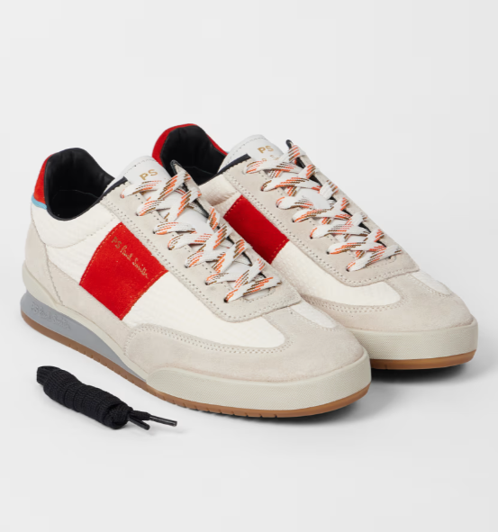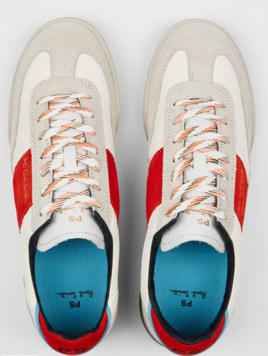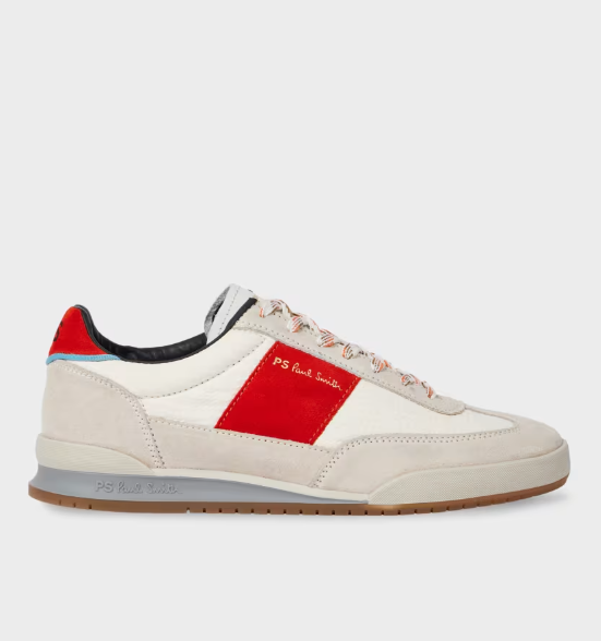 Paul Smith Scarpe da ginnastica ‘Dover’ bianche e rosse Realizzate in Portogallo con tomaia in pregiata pelle scamosciata, queste sneaker bianche ‘Dover’ presentano pannelli a quadri tono su tono e pannelli laterali e sul tallone rossi a contrasto. Perfette per uno stile quotidiano con un tocco di colore brillante, queste sneaker sono rifinite con lacci maculati e solette ammortizzate per il massimo comfort e la massima praticità. Grazie alla loro silhouette versatile, queste sneaker si abbinano bene sia a look rilassati che smart-casual. Materiale Tomaia in pelle di mucca al 70%, tomaia in nylon al 30%, suola in gomma al 100% Prodotto in Portogallo Codice prodotto M2S-DVR95-UNYL-01