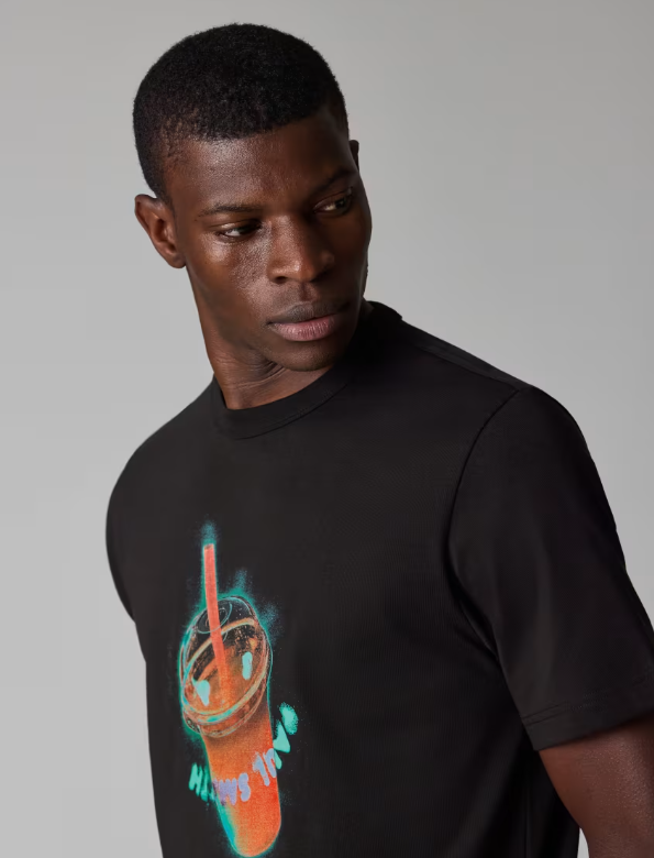 Paul Smith Maglietta nera con stampa ‘Sunbleached Snaps’ Realizzata in 100% cotone biologico per una finitura morbida, questa t-shirt nera girocollo presenta una stampa ‘Sunbleached Snaps’ sul davanti. Dal taglio regular fit, questa t-shirt è rifinita con un colletto a costine cucito. La dimensione La modella indossa una taglia M Misure della modella: Altezza 6’2½” / 189,5 cm | Torace 36½” / 93 cm | Vita 29” / 73,5 cm La vestibilità – Vestibilità regolare Materiale 100% cotone biologico Codice prodotto M2R-220X-VP5758-79 Informazioni sulla cura Lavabile in lavatrice Sostenibilità Almeno il 50% dei materiali utilizzati per realizzare questo prodotto ha un impatto ambientale ridotto. Se trovate il nostro logo Sun nei nostri negozi o online, significa che questo prodotto è stato realizzato con materiali a basso impatto ambientale.