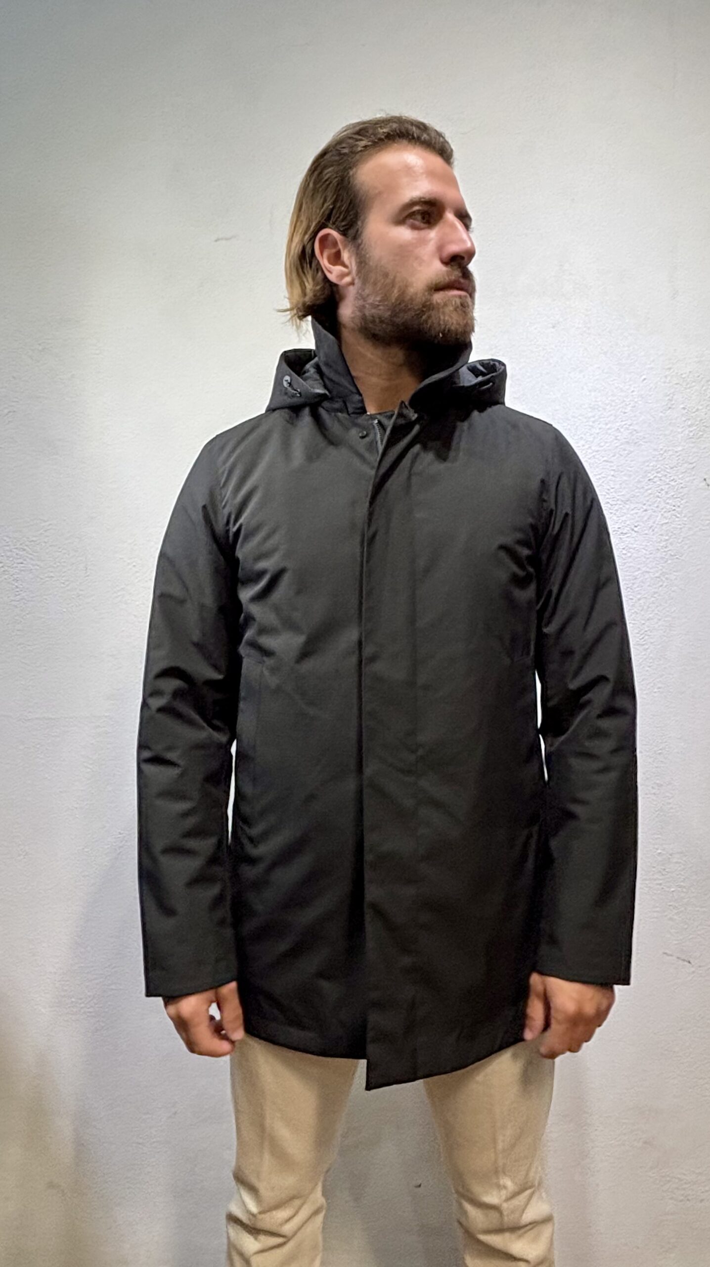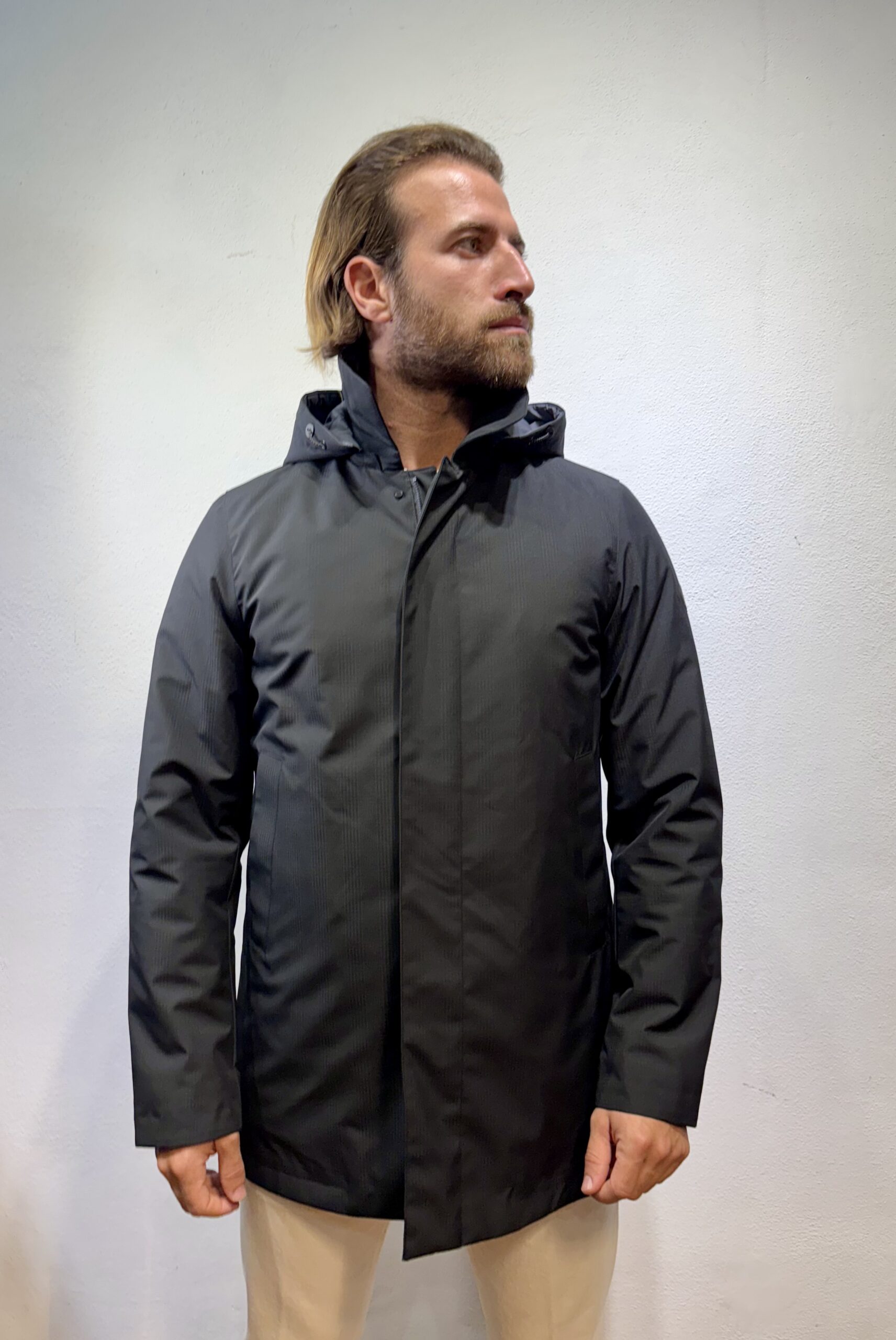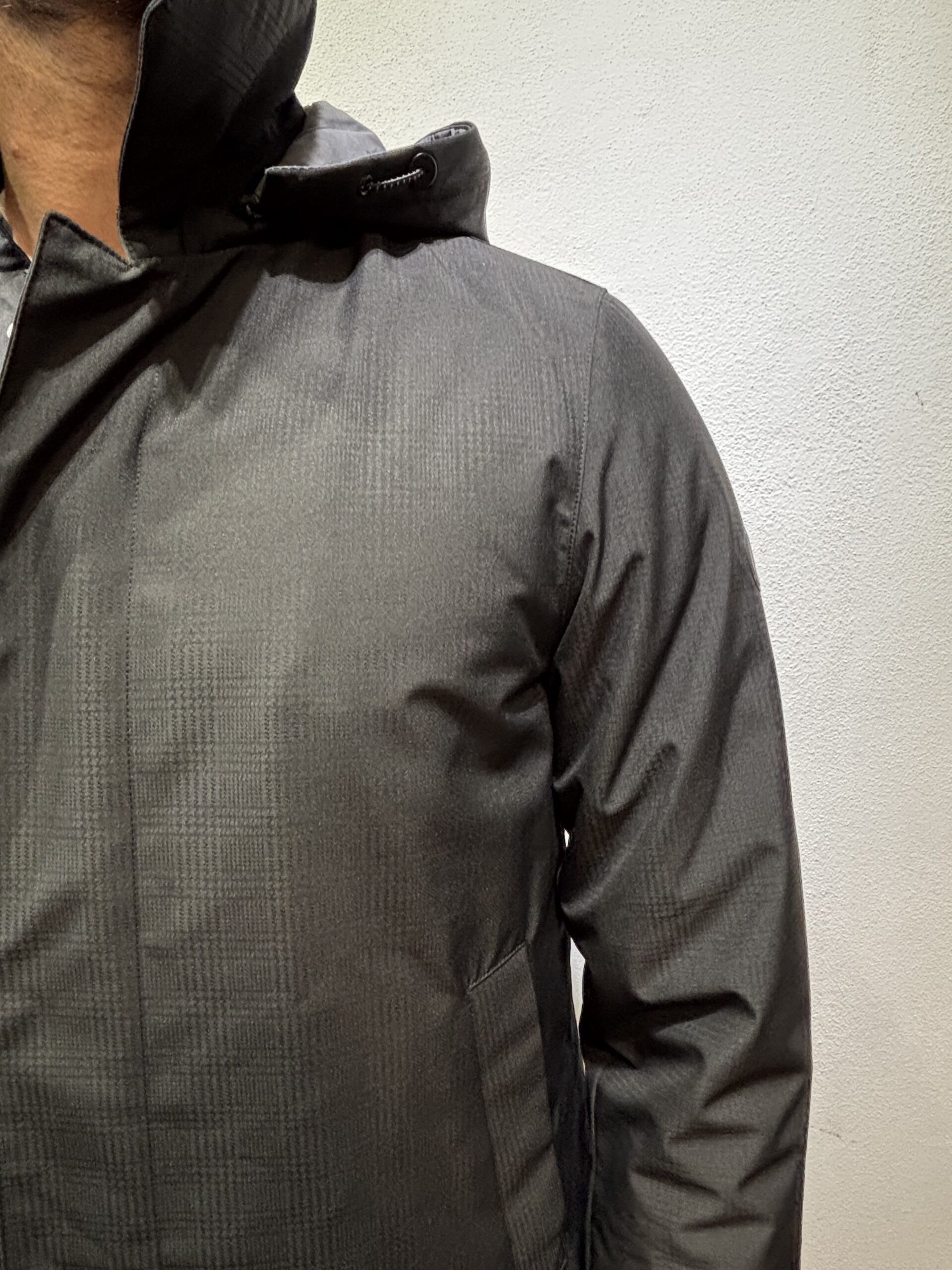 People of Shibuya trench imbottito con cappuccio in stampa principe di galles nero TAKUYA PM942 999 TRENCH TECNICO NERODescrizione Parka in tessuto tecnico con cappuccio con coulisse. Interno trapuntato in isolante termico “PRIMALOFT”. Zip pressofusa doppio cursore con tiretto personalizzato. Coprizip principale con chiusura bottoni a pressione nascosti. Finta interna zip principale con particolare taglio laser. Aeratori laserati interni per agevolare l’indossaggio e la traspirazione. Tasche esterne tagliate al laser con zip. Tasche interne portadocumenti e portacellulare nastrate con zip. Badge brand su manica sinistra. Etichetta in gomma sulla manica destra con coordinate geografiche relative allo Shibuya Crossing. Composizione: 88% poliammide, 12% elastan.