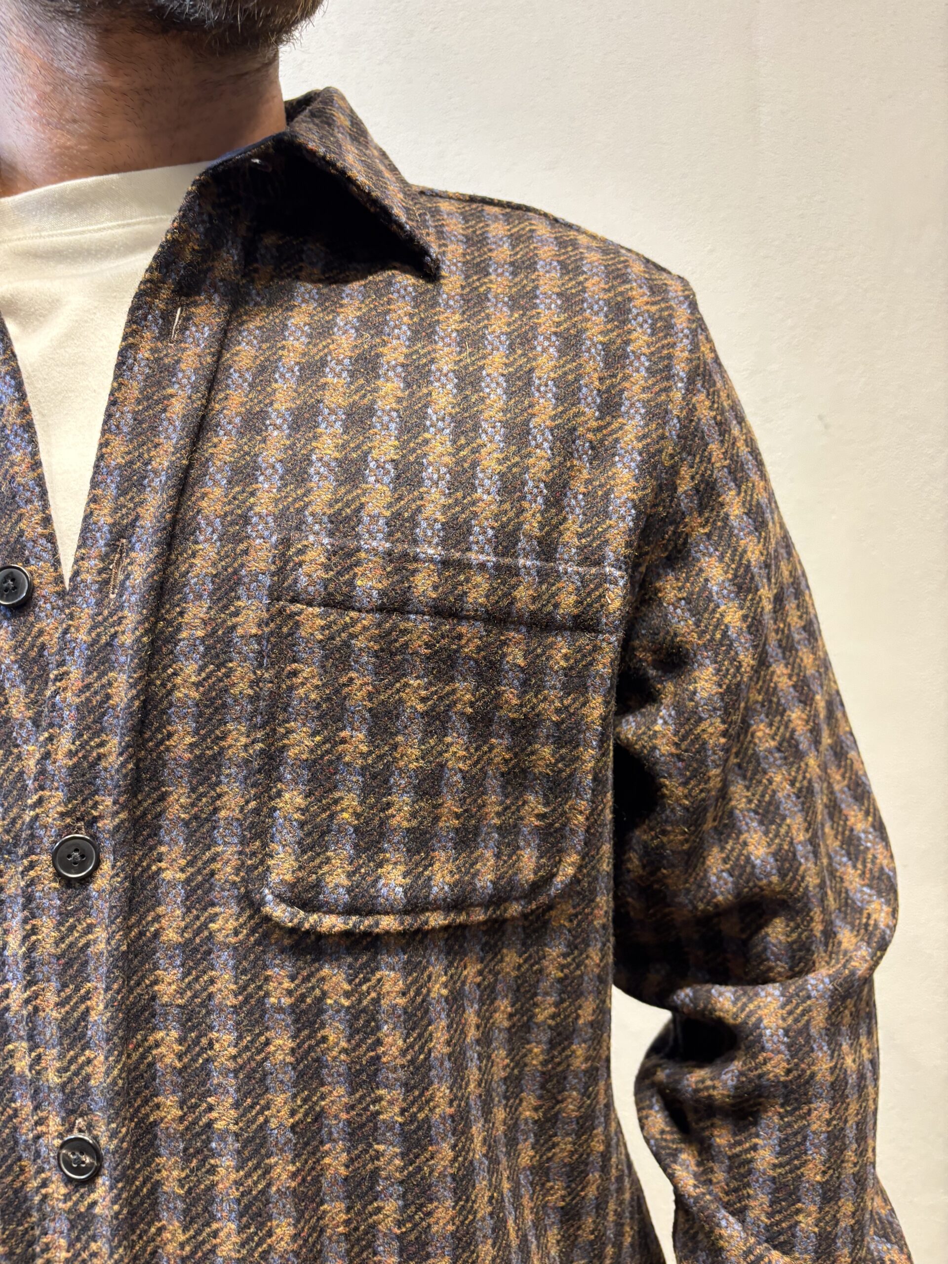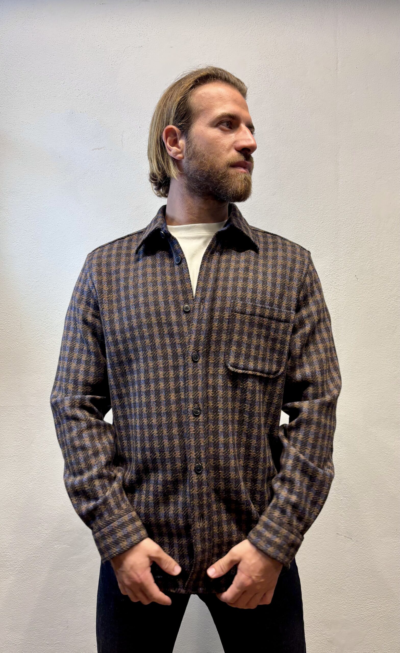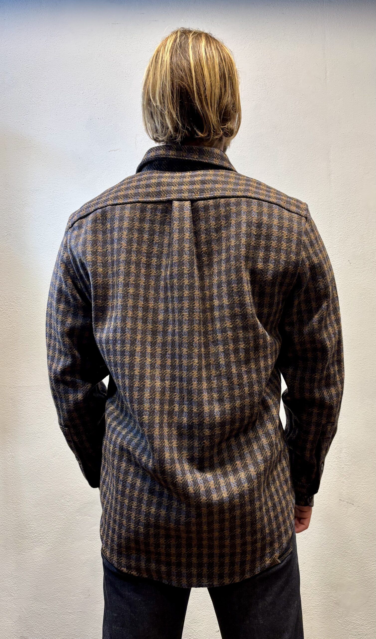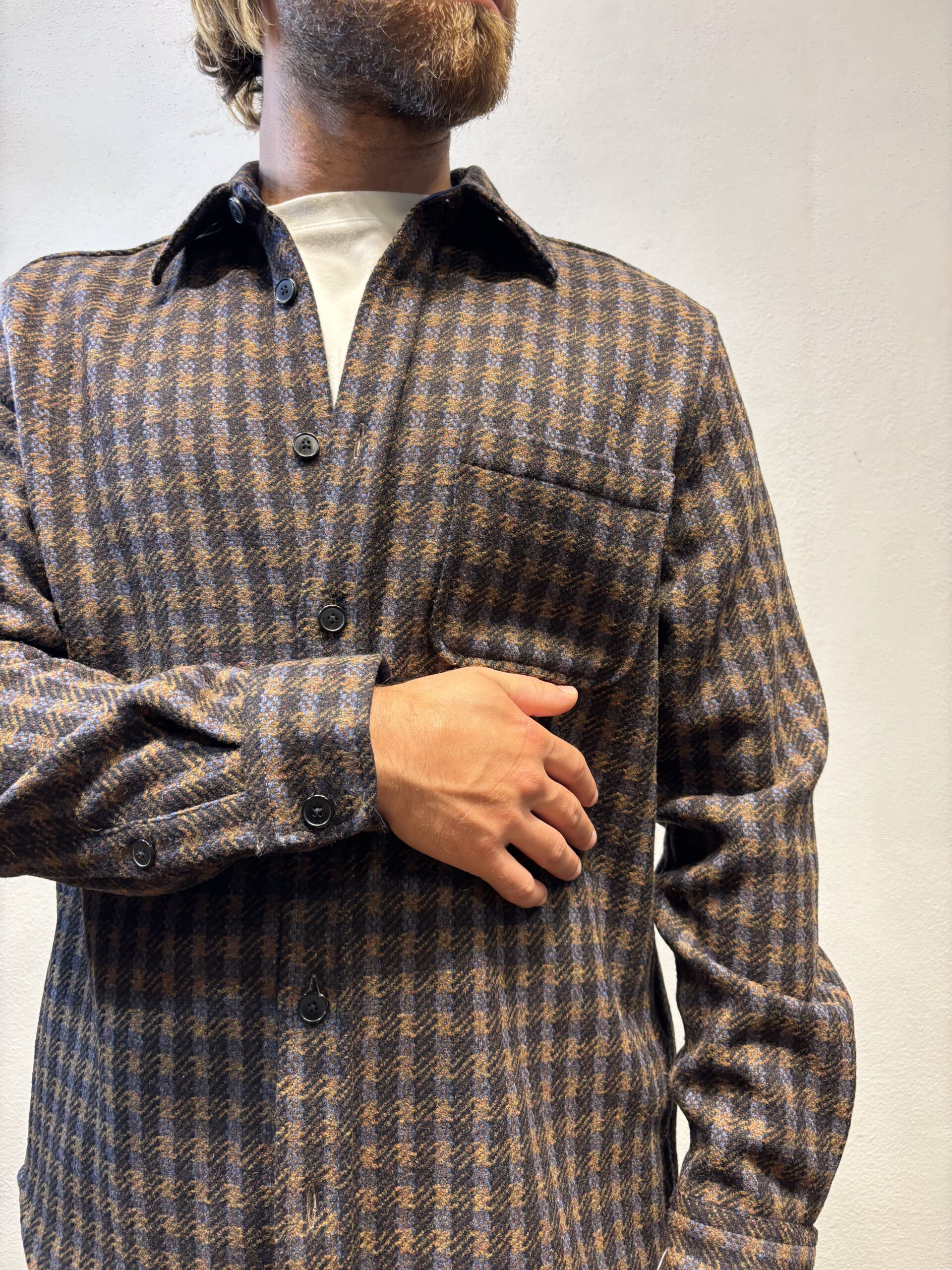 Portuguese Flannel Over shirt in lana tweed blu e testa moro MERINO TWEED MICRO QUADRO BLU Over shrit vestibilità regular Made in Portogallo Composizione 100% lana merinos Made in Italy Il modello veste una taglia Media 48 italiana Altezza modello 1,81 peso 78 kg