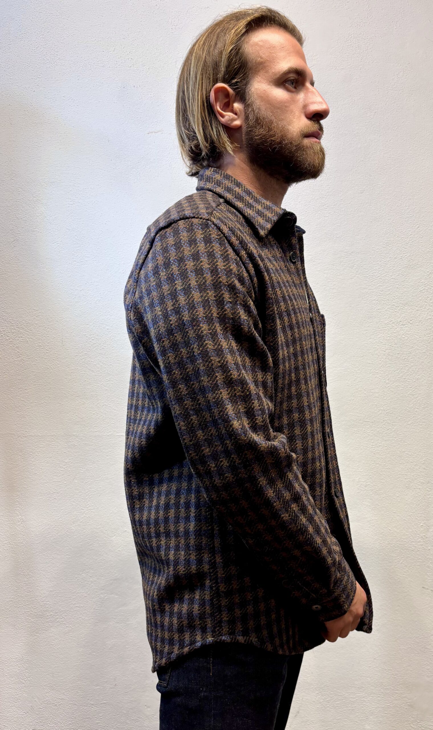 Portuguese Flannel Over shirt in lana tweed blu e testa moro