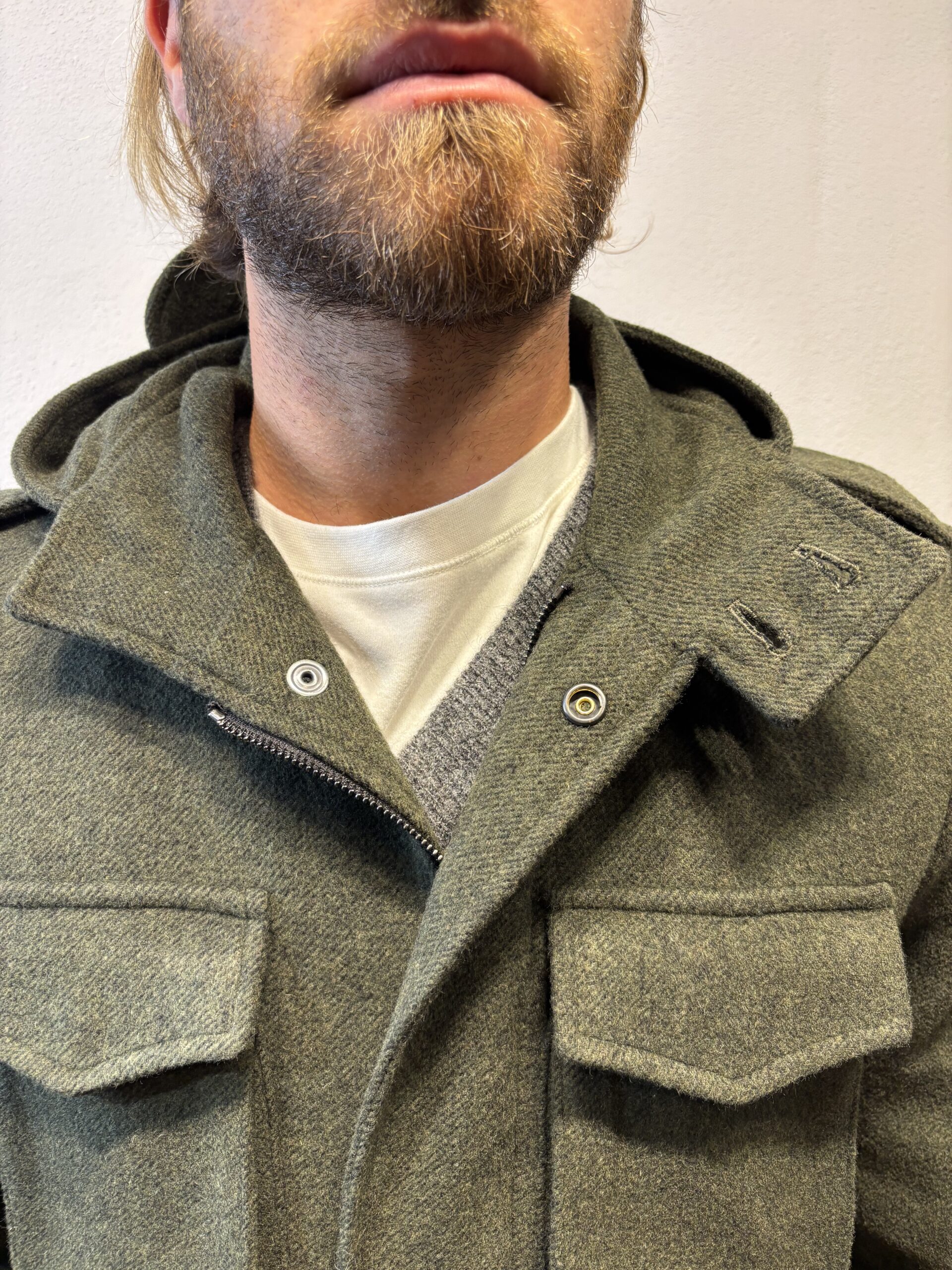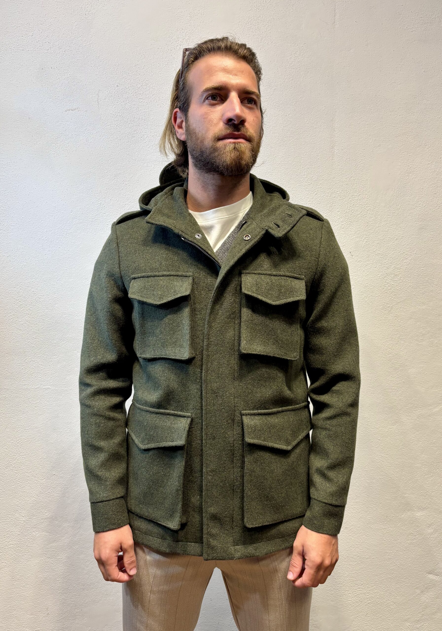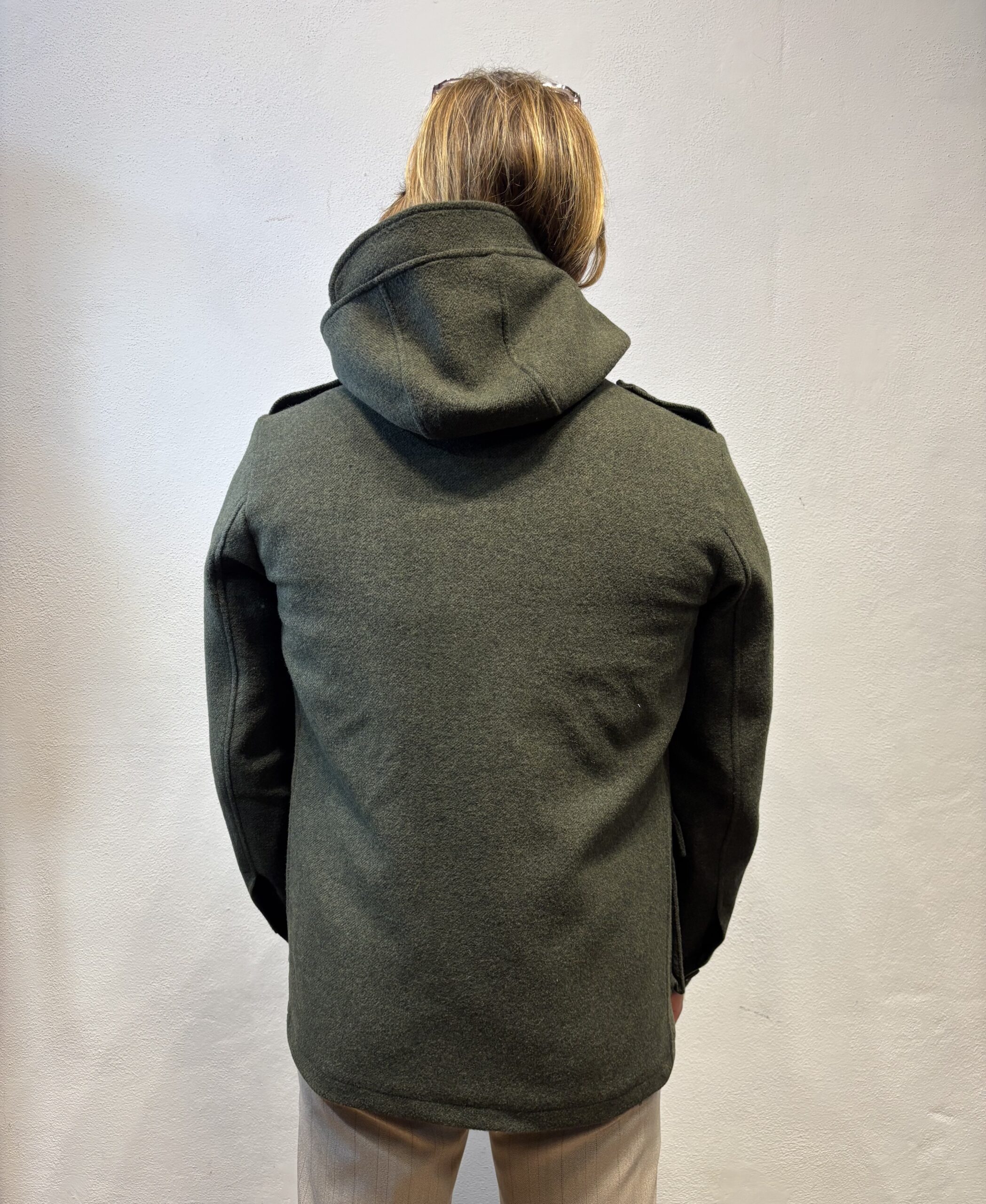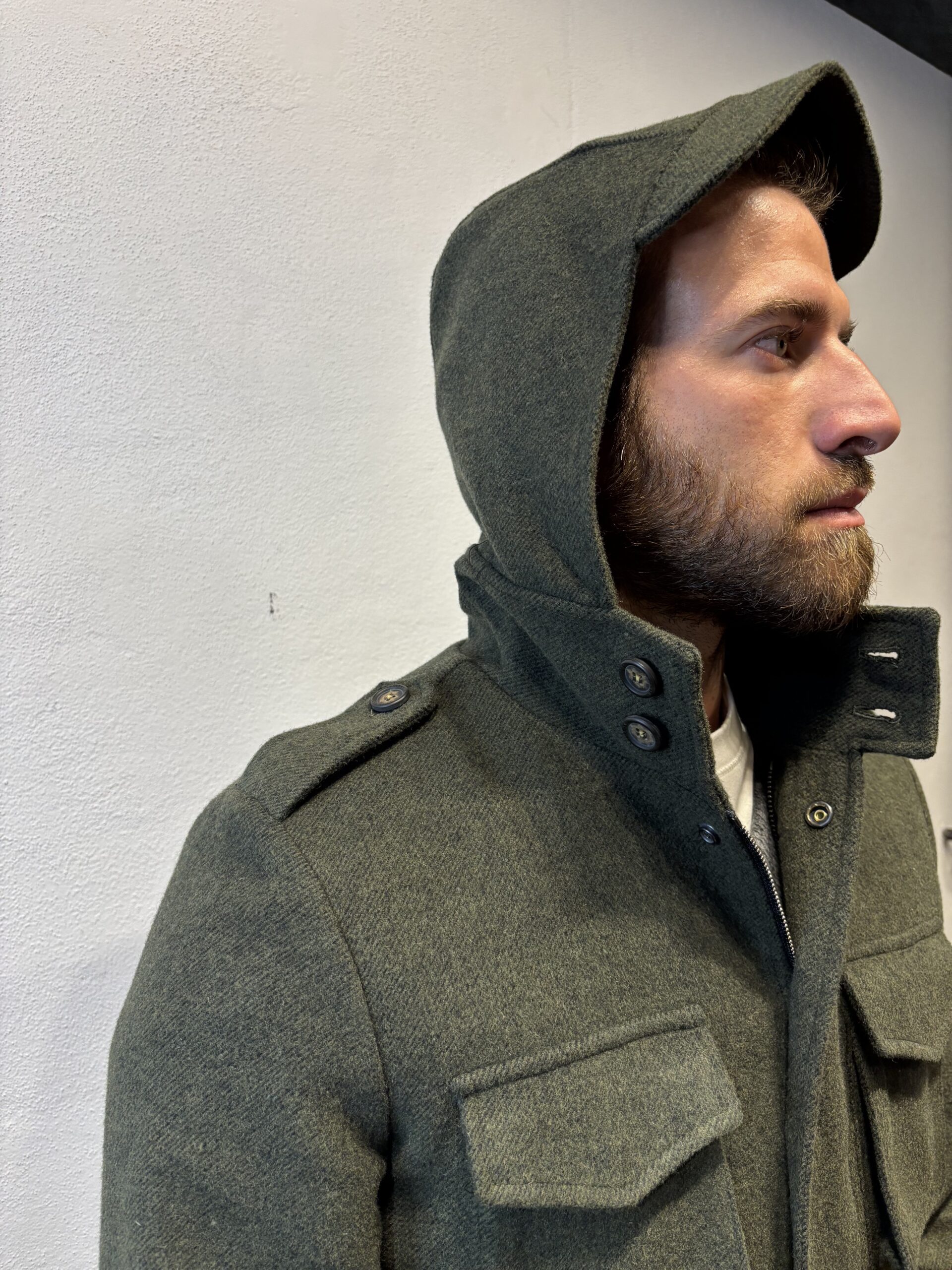 Renavine parka corto con tasche e cappuccio verde militare OLIVE WOOL B5 PARKA TASCHE MILITARE Parka / field jacket con cappuccio. Zip e bottoni Composizione: 25% lana 25% poliestere 50% acrilico Made in Italy Il modello veste una taglia Media 48 italiana Altezza modello 1,81 peso 78 kg