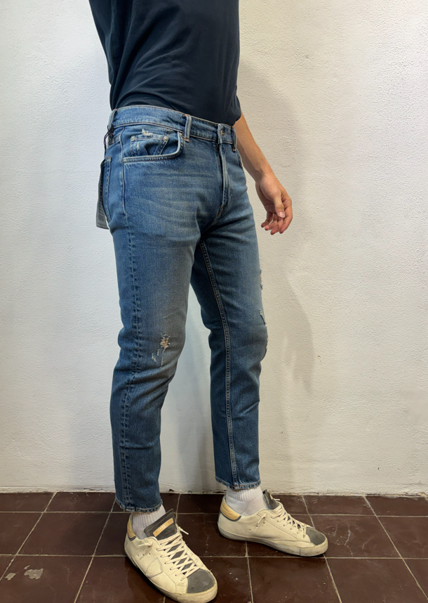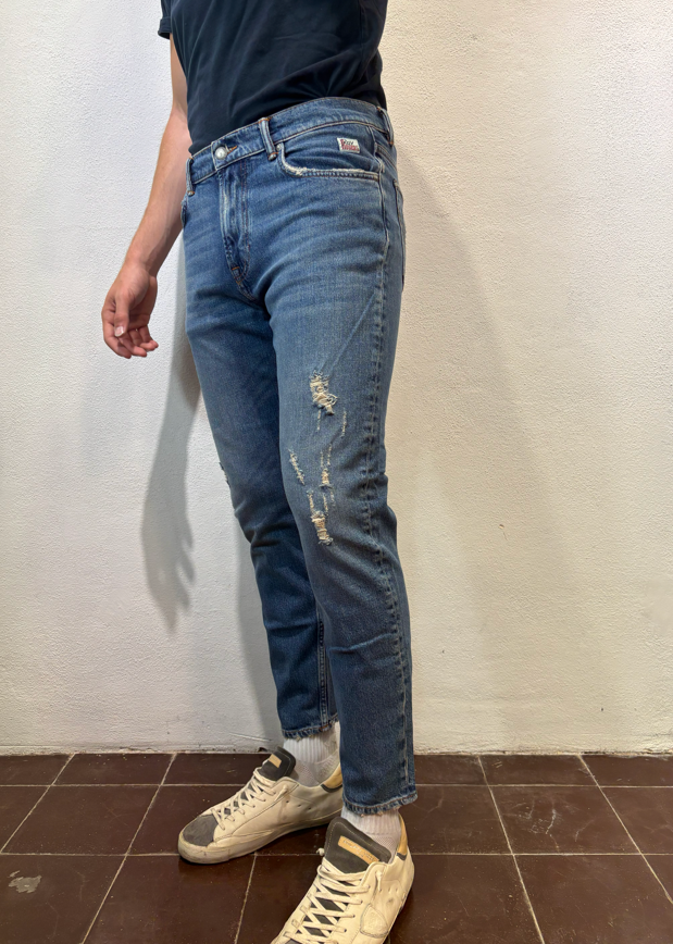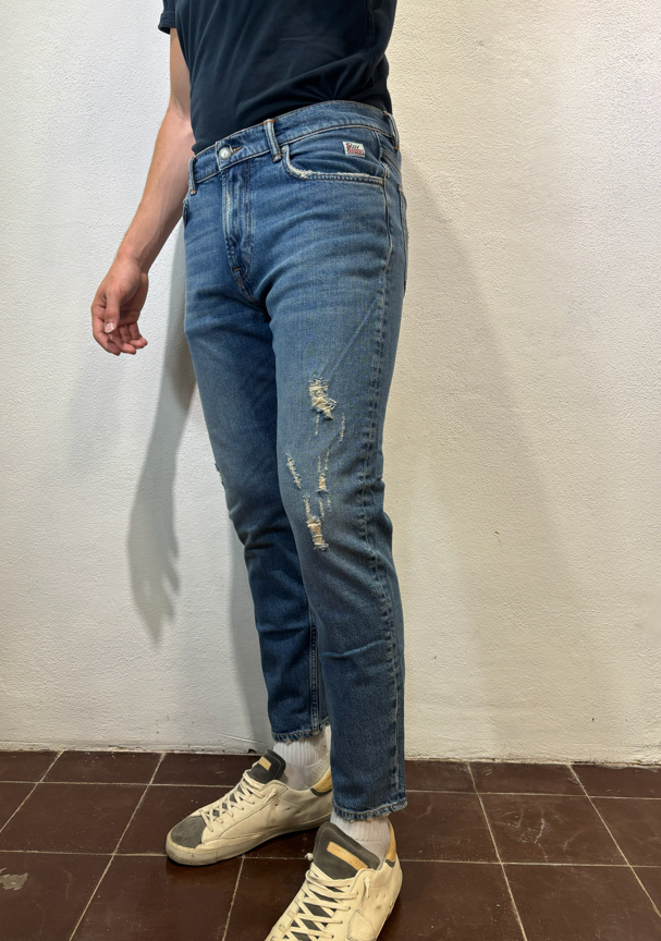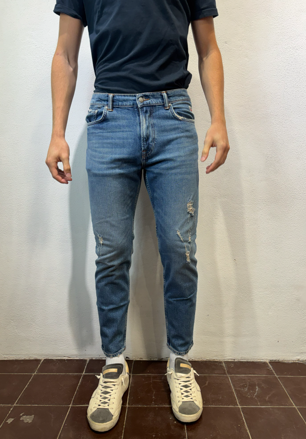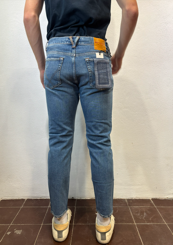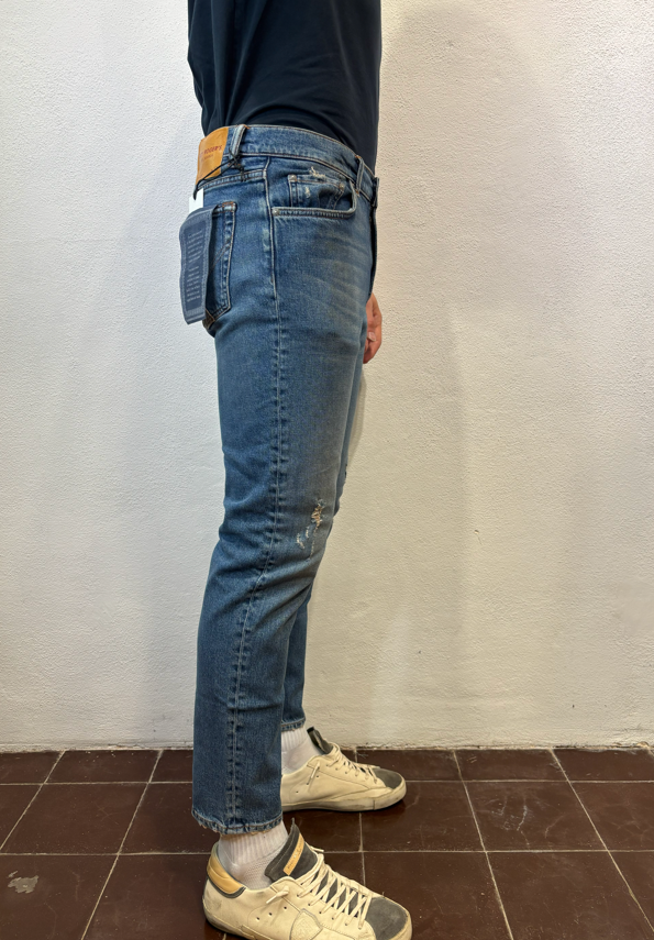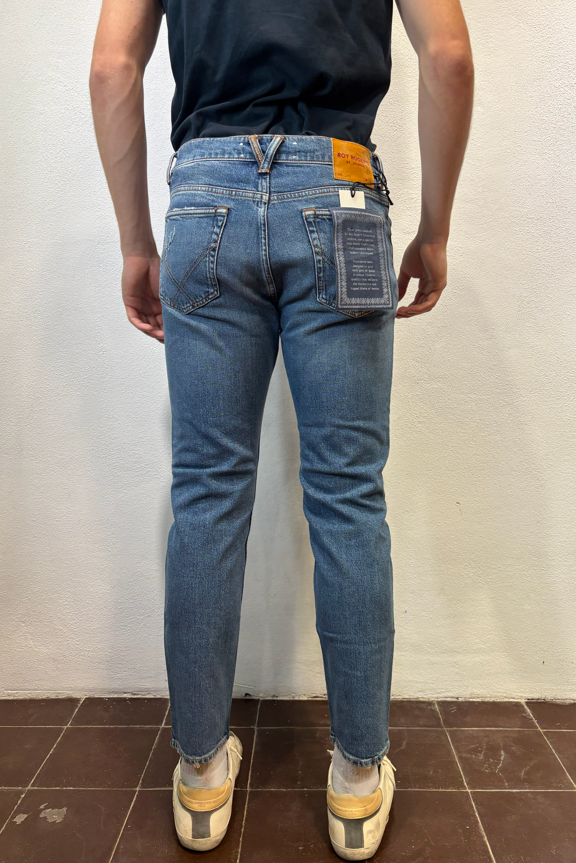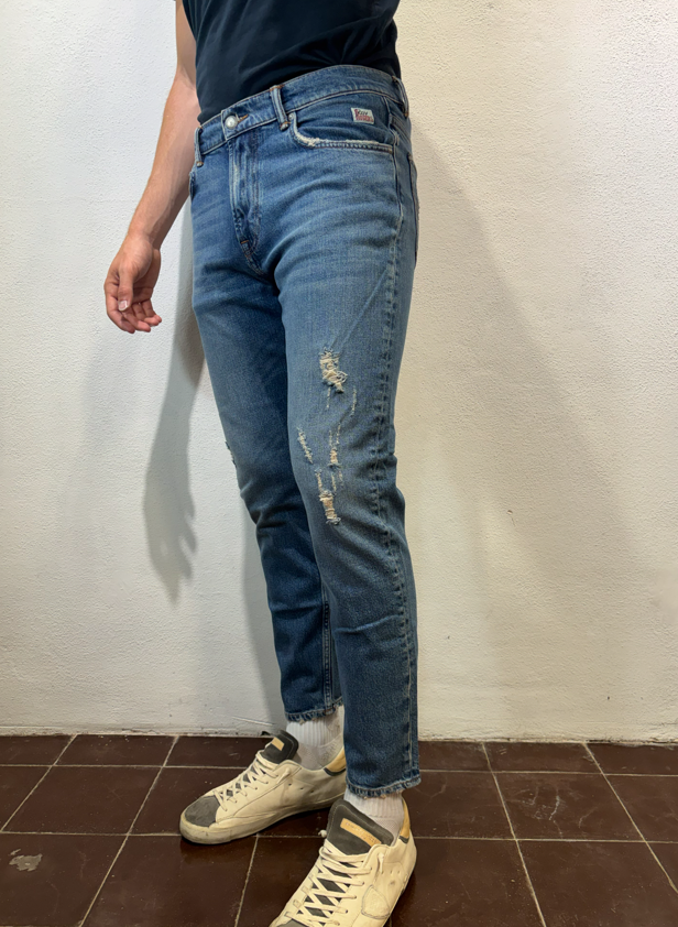 Roy Rogers Jeans ”dapper” torrent strappi DAPPER TORRENT JEANS CARROT DENIM Jeans Re-search in denim con lavaggio medio. Leggere baffature sul fronte, strappi ricuciti su entrambe le gambe Vita media con passanti. Chiusura con bottoni logati. Due tasche sul fronte e due tasche sul retro con label Roy Roger’s applicata. Carrot fit.