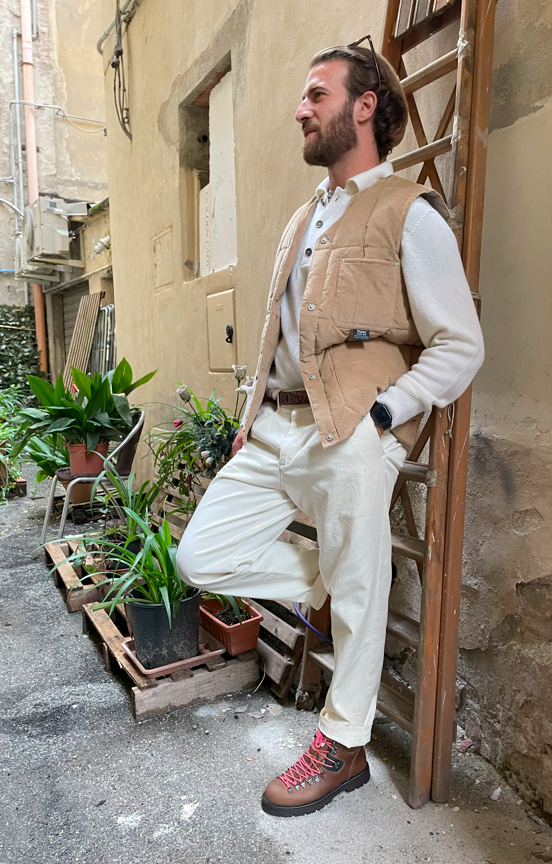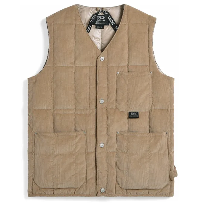 Taion gilet in velluto beige 001 BNK CT BIEGE GILET VELLUTO BEIGE esterono 100% cotone esterno imbottituta 100% piuma soft fodera 100% poliestere Made in china DETTAGLI – Tessuto esterno in velluto a coste – Imbottitura in piuma d’oca 800 FP di alta qualità – Abbottonatura frontale con bottoni YKK in metallo (con logo TAION in rilievo) – Aree rinforzate con rivetti YKK in metallo – Passante per martello sul lato sinistro – Tasca con patta sulla schiena sinistra. – Tasche applicate sul petto a sinistra e su entrambi i fianchi. – Tasca nascosta applicata sulla schiena destra. – Borsa portaoggetti inclusa. Si ripone in modo compatto ed è facile da trasportare. Ideale per uscire o viaggiare.