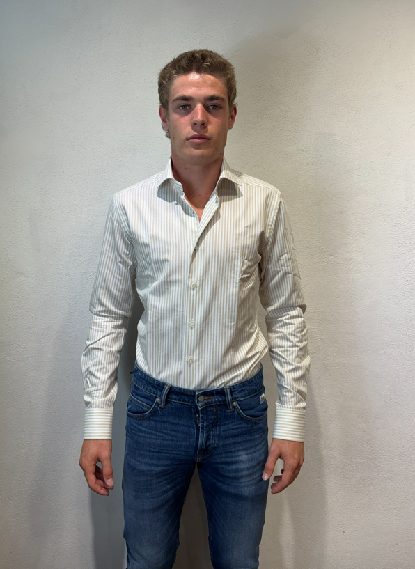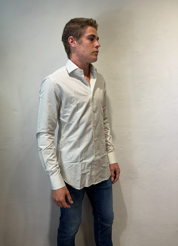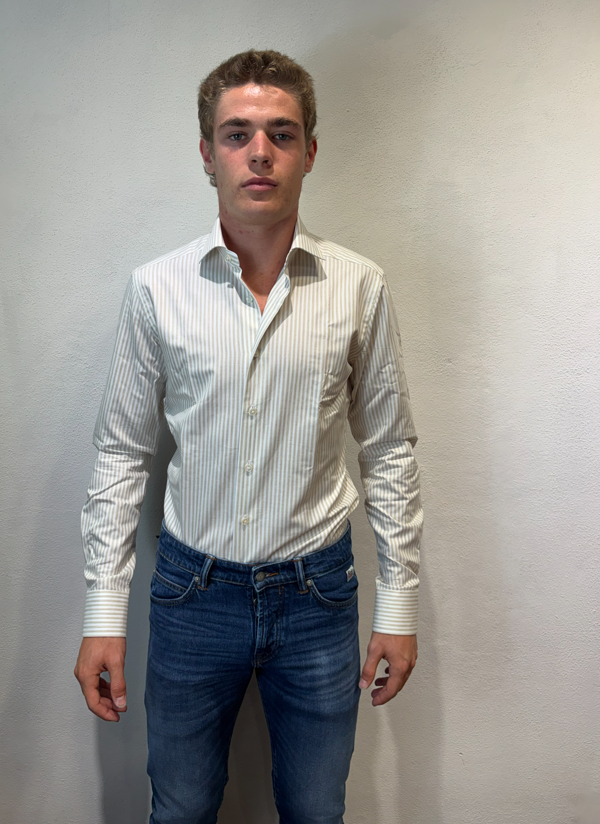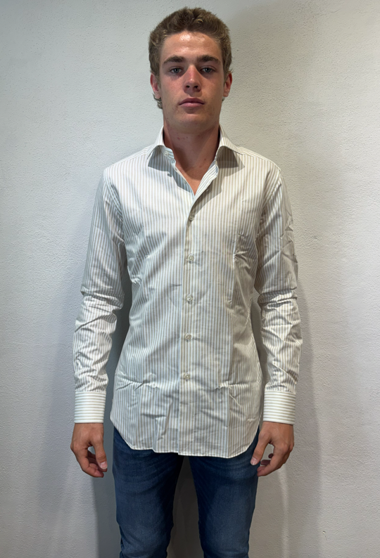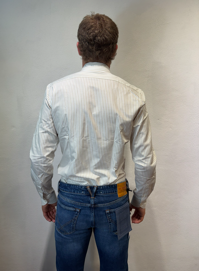 Xacus camicia macro bastoncino in cotone tortora Camicia sartoriale in cotone gessato 100% cotone Il modello veste una taglia 39/ M /48 Altezza Modello 1,85 peso 72 kg